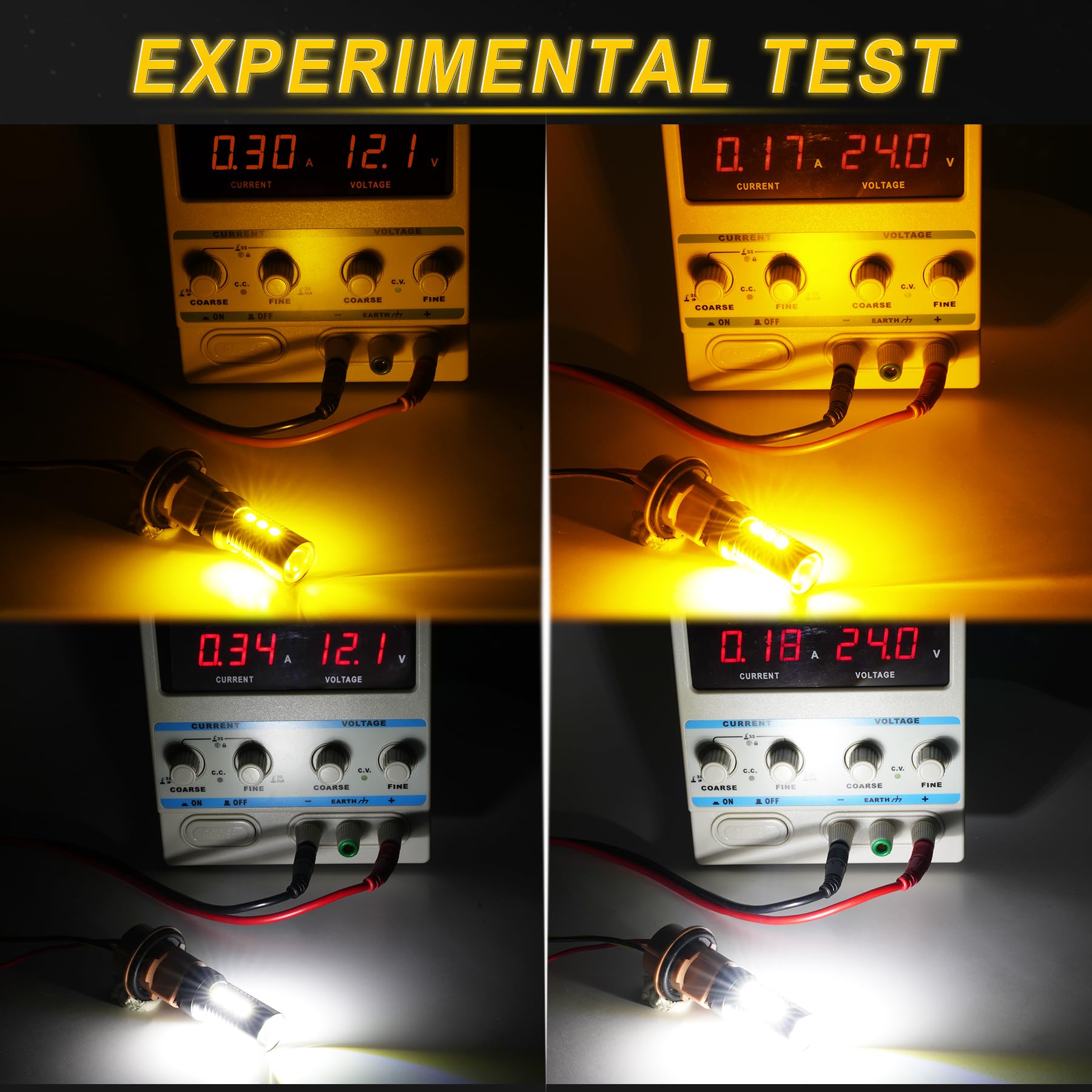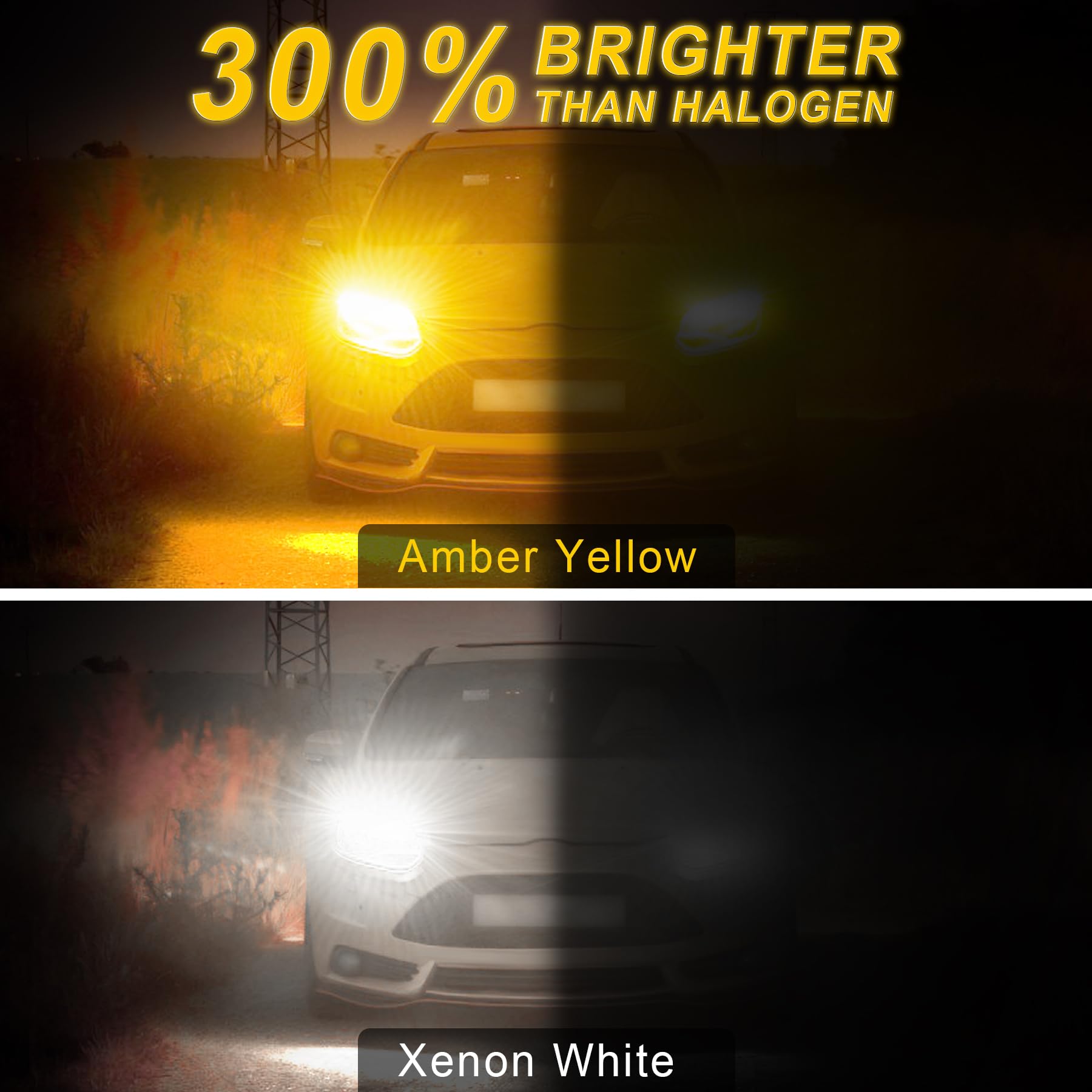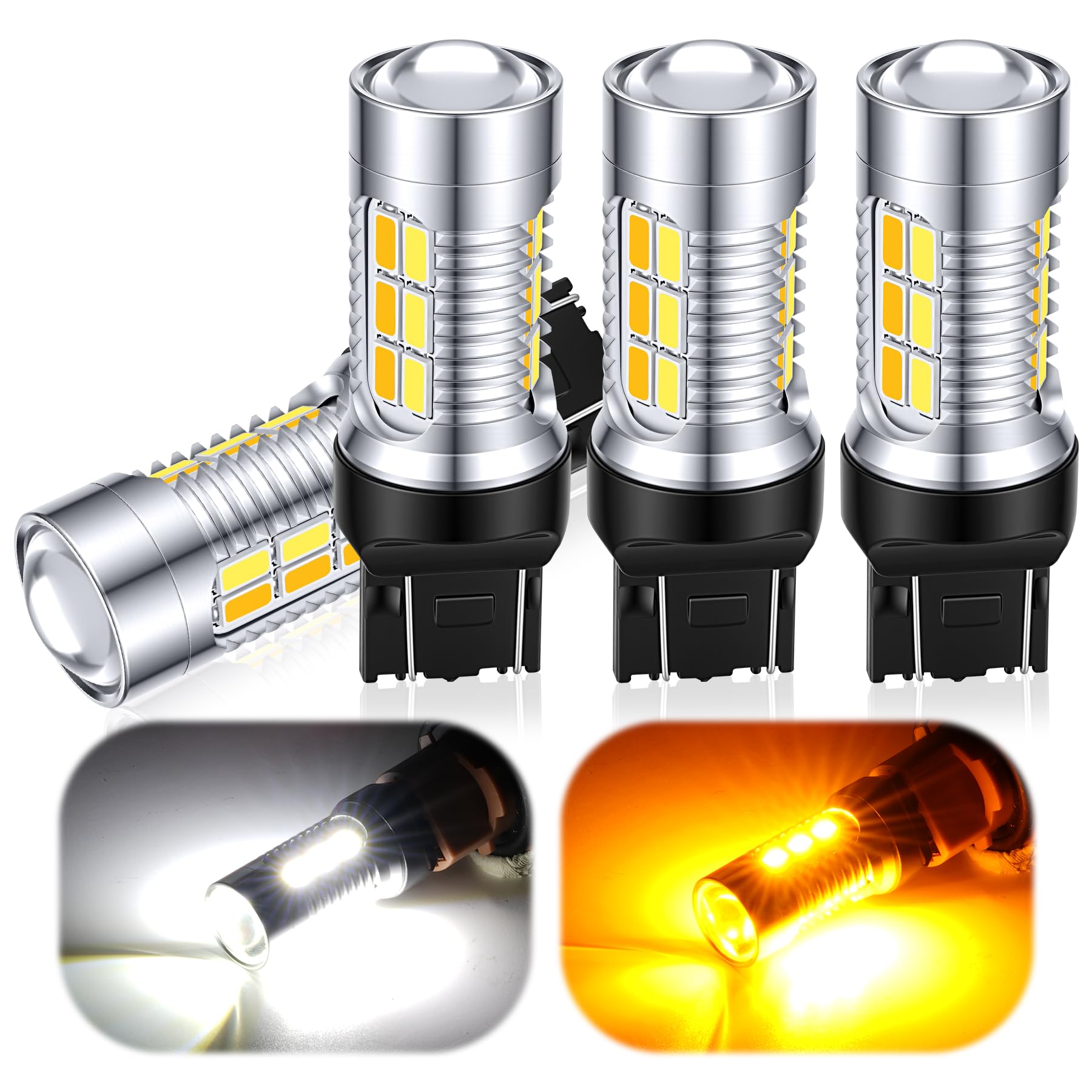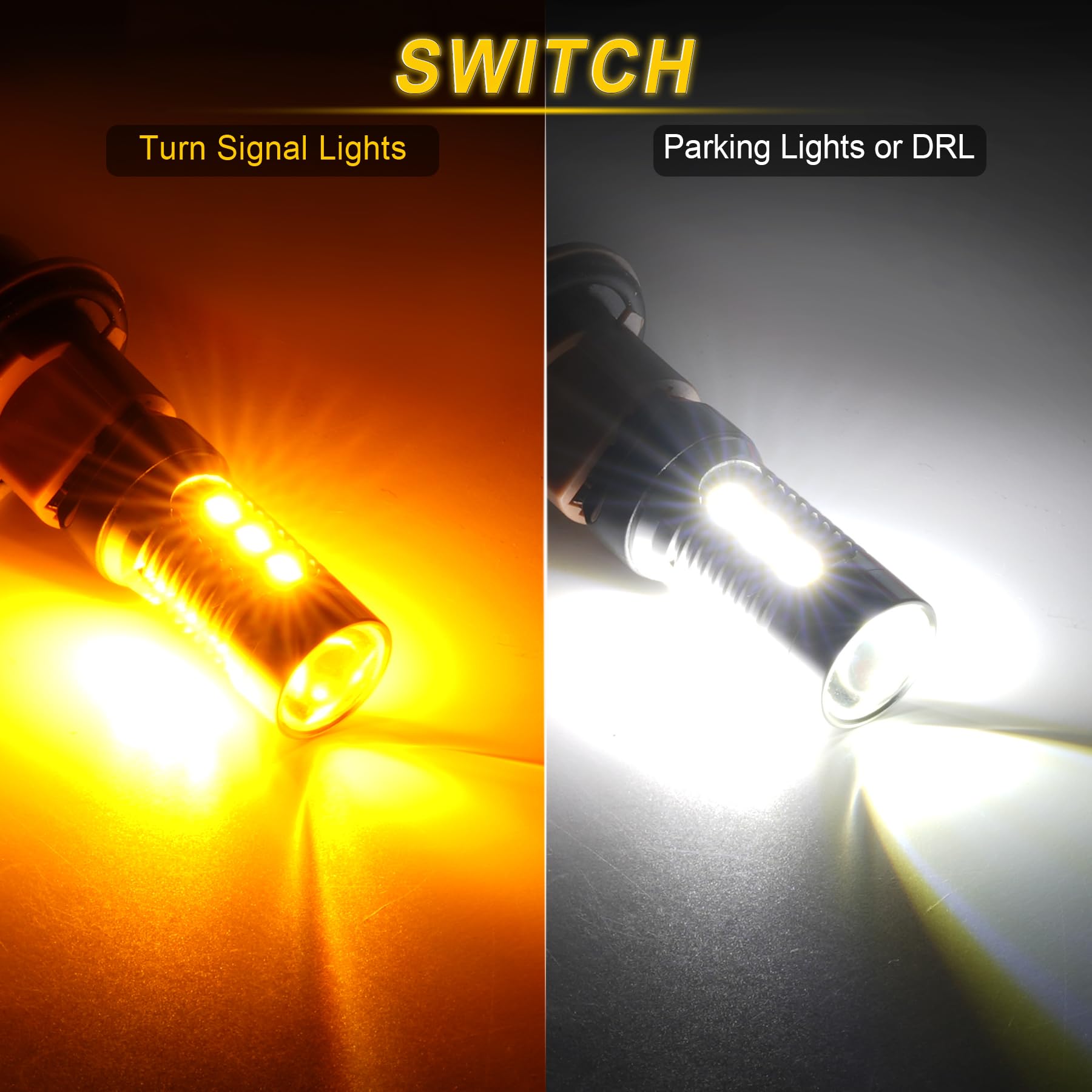 【Application】 Light up Xenon White for parking lights or daytime running lights, Light up Amber for turn signal lights.The turn signal flashes "amber-off-amber-off" instead of "amber-white-amber-white", which makes it easier to see(Most switchback bulb on the market flash amber-white-amber-white).