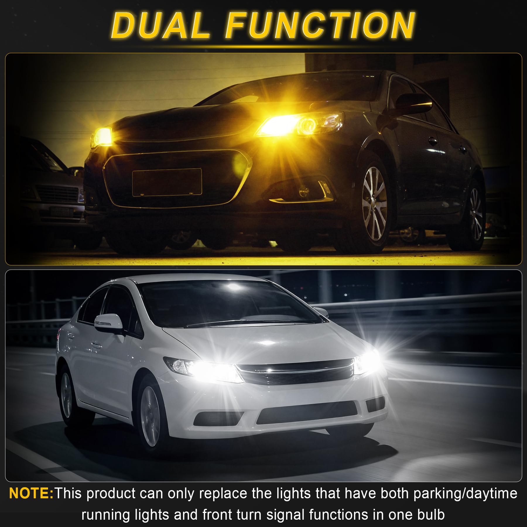 【Note before purchase】This product can only replace the lights that have both parking/daytime running lights and front turn signal functions in one bulb, so you have to make sure your bulb must have both functions, otherwise, it can only have one color or not light up normally.