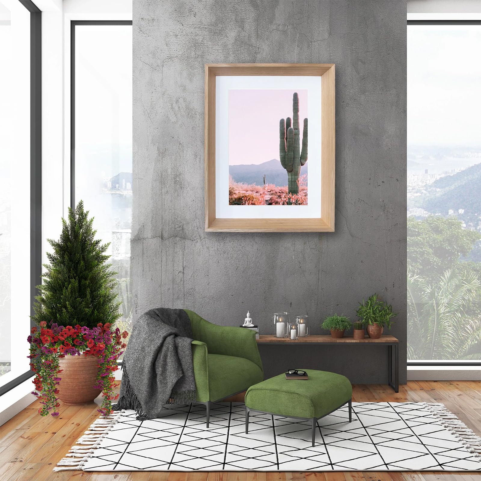Realistic Design & Quality Materials: Our faux cedar tree is made of high-quality plastic and PE materials and designed with simulation technology to create natural color, texture, and layered detail. Each leaf shows clear texture and a lifelike appearance, with fresh bud elements that add depth. The flexible branches and leaves can be easily bent and adjusted to shape the tree or fit different spaces.