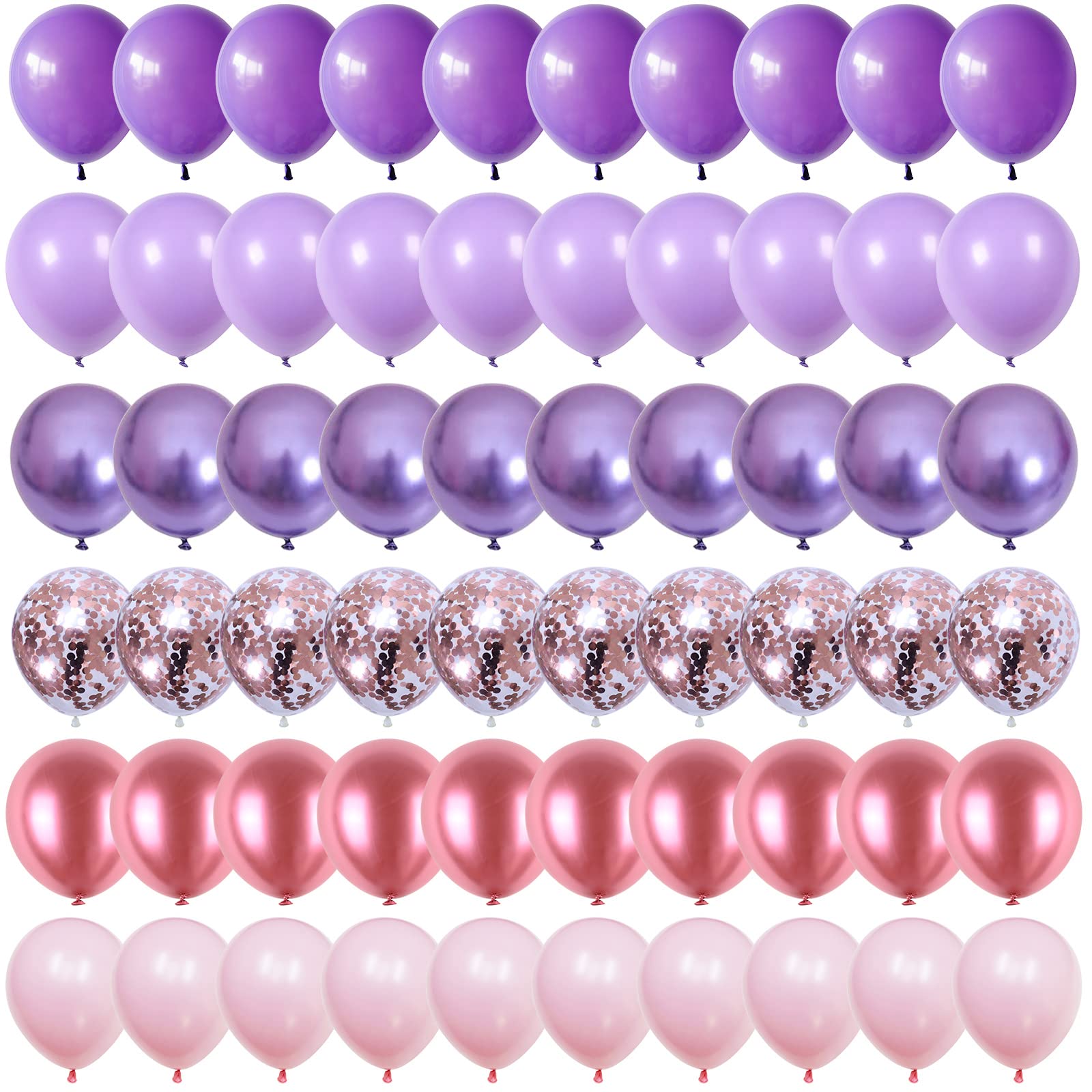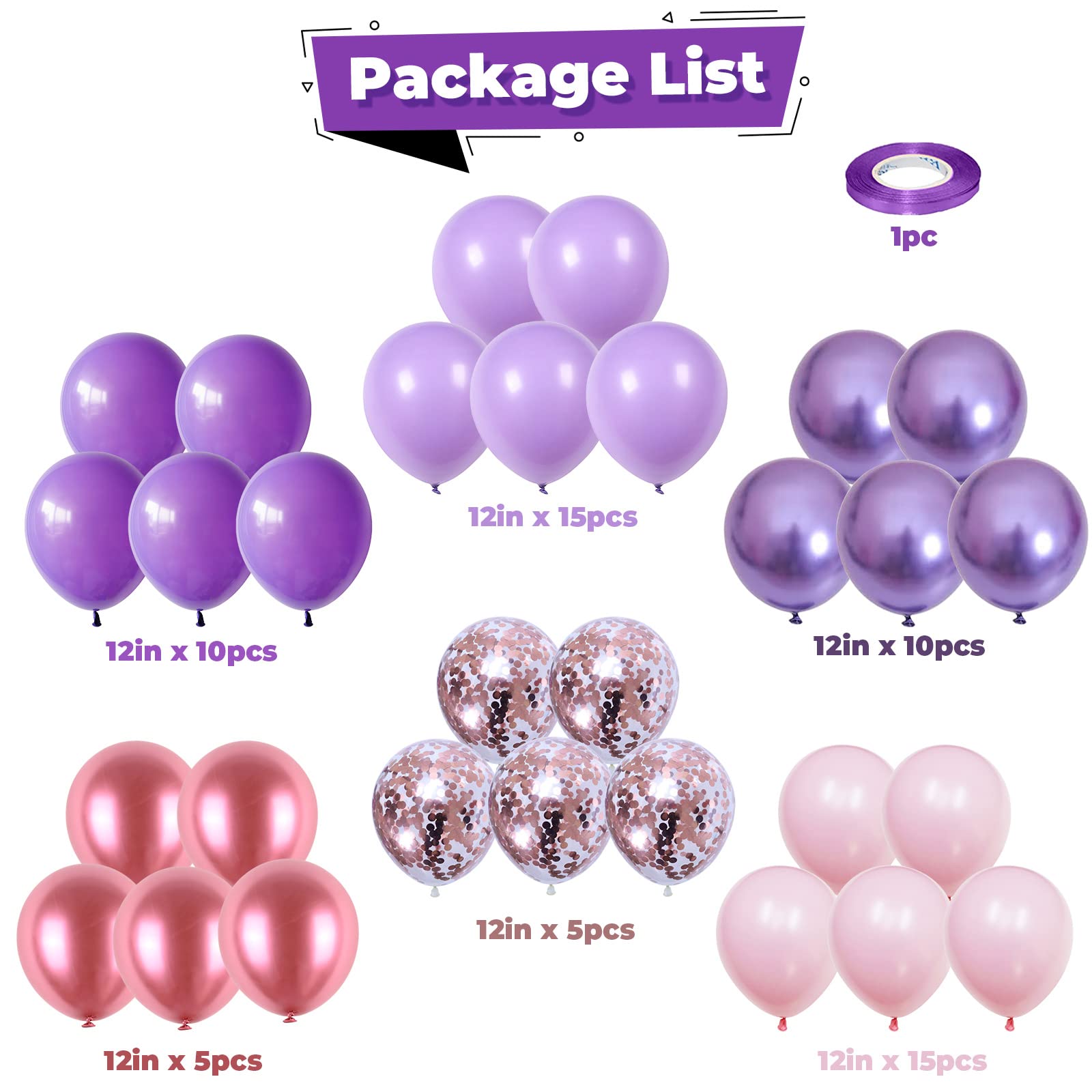 WHAT YOU GET: Purple pink red gold balloons set includes 60pcs latex balloons: 15pcs 12inch pastel pink balloons, 15pcs 12inch pastel purple balloons, 10pcs 12inch matte purple balloons, 5pcs 12inch metallic red balloons, 10pcs 12inch metallic purple balloons, 5pcs rose gold confetti ballons, 1 roll of ribbon, ideal for making balloon garland, balloon arch