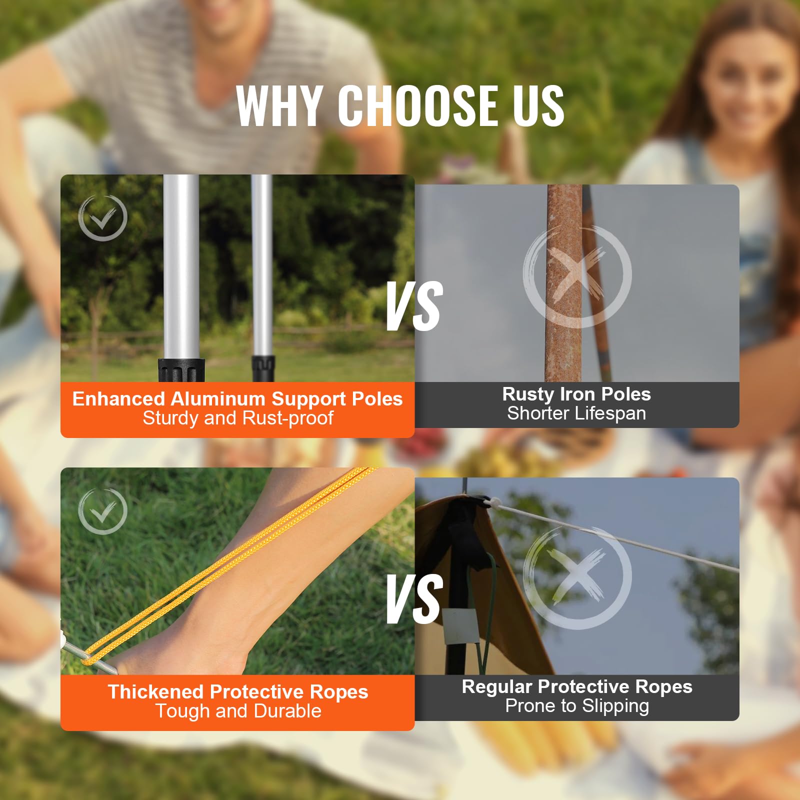 【Quick Set-up】Telescopic roof frames and supporting poles with twist-lock feature allow for quick and simple set-up and pack-up in just 1 minute. All metal joints and poles are made of anodized aluminum with a powdered coating finish for permanent rust prevention.