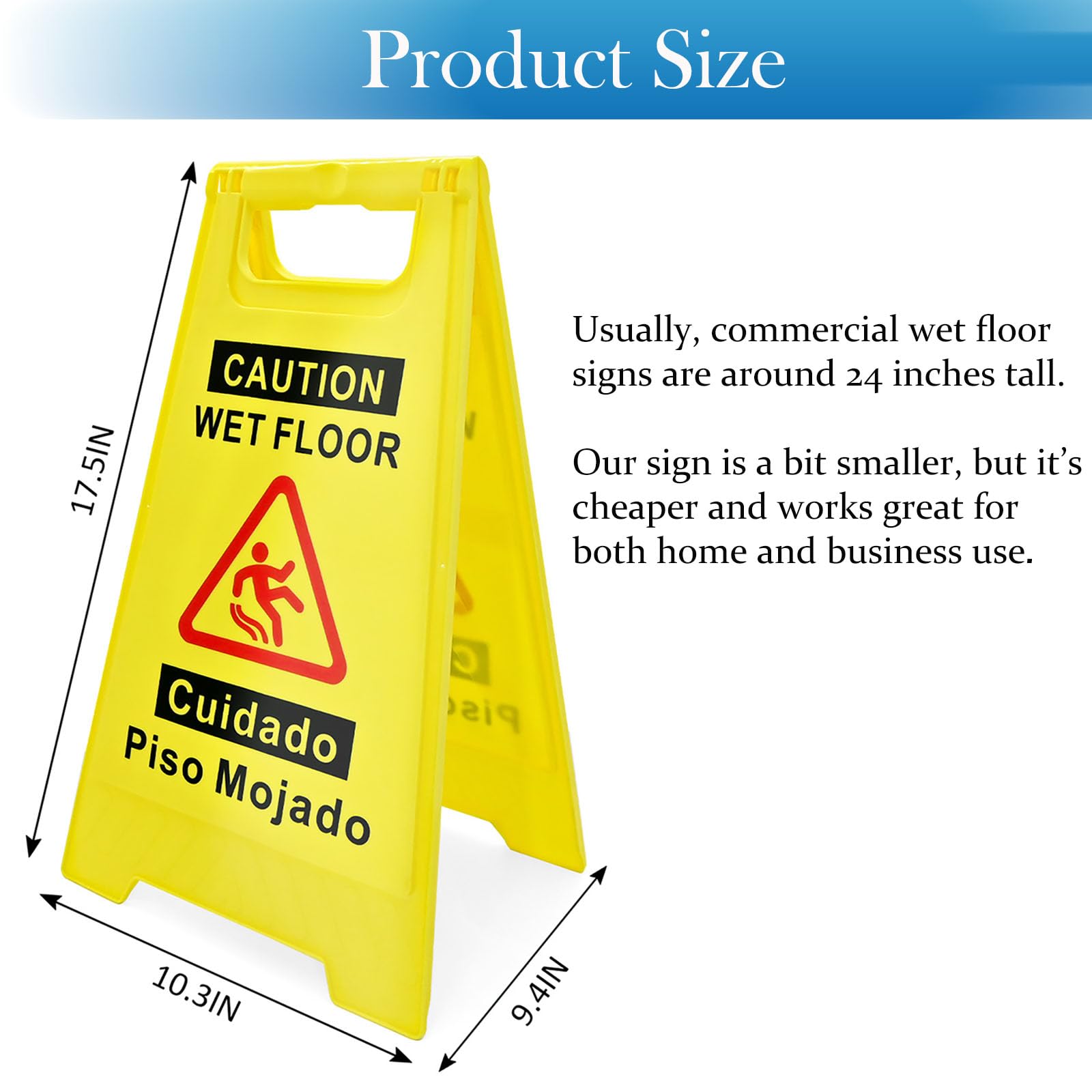 [PRODUCT SIZE] - Our product is 17.5 inches tall. Usually, commercial wet floor signs are around 24 inches high. So our sign is a bit smaller, but it's cheaper and works great for both home and business use.