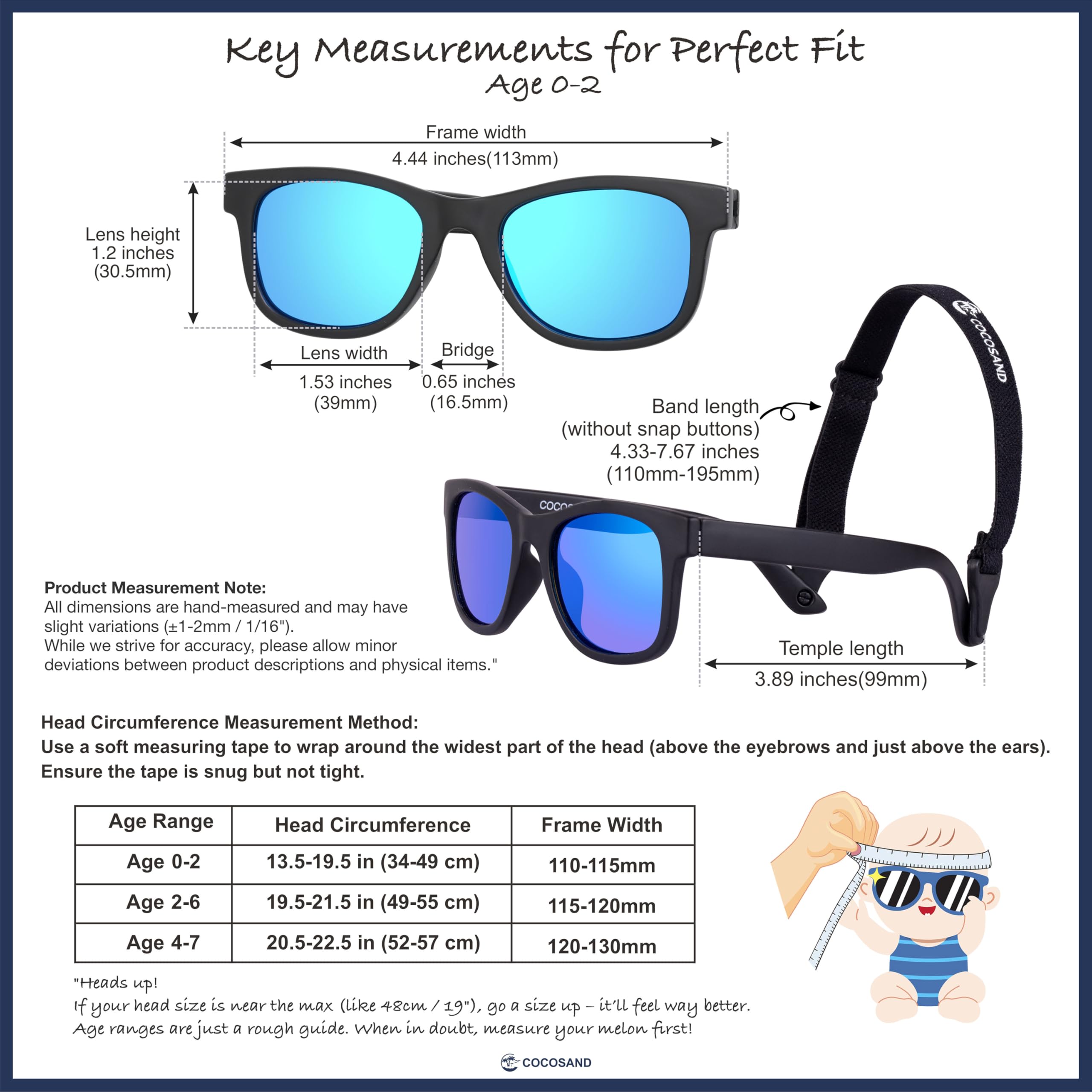 【Perfect Fit for Growing Babies】:Our infant sunglasses fit babies with head circumferences up to 48cm. The adjustable temple and 110-195mm strap mean a custom fit for every stage. Whether your baby boy or baby girl is growing fast, these sunglasses grow with them