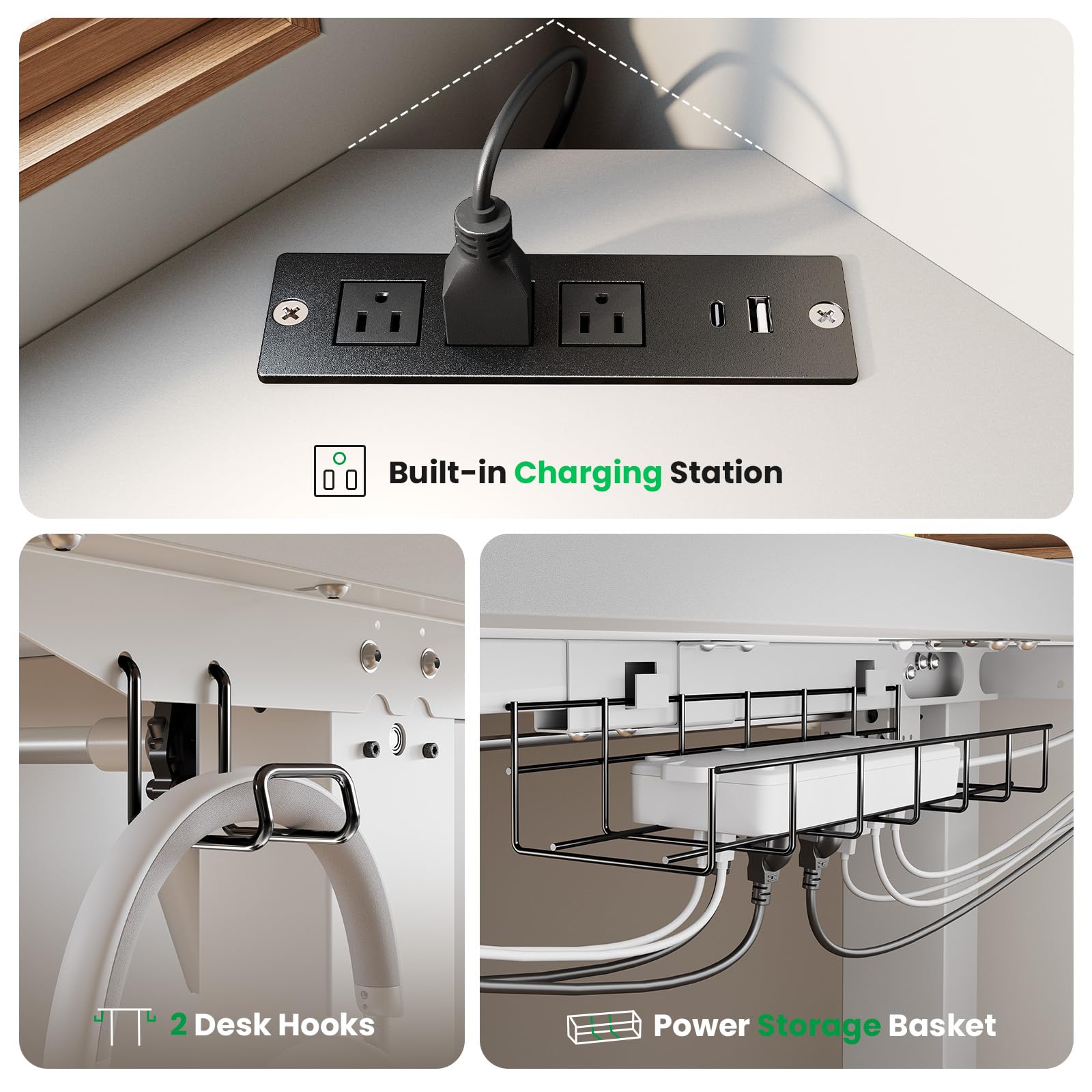 【Enjoy Easy and Convenient Charging】The L-shaped standing desktop features 3 AC outlets and dual USB fast-charging ports (Type-A/C) for all your devices. Built-in cable management with two headphone hooks keeps wires organized, maintaining a clean workspace effortlessly.