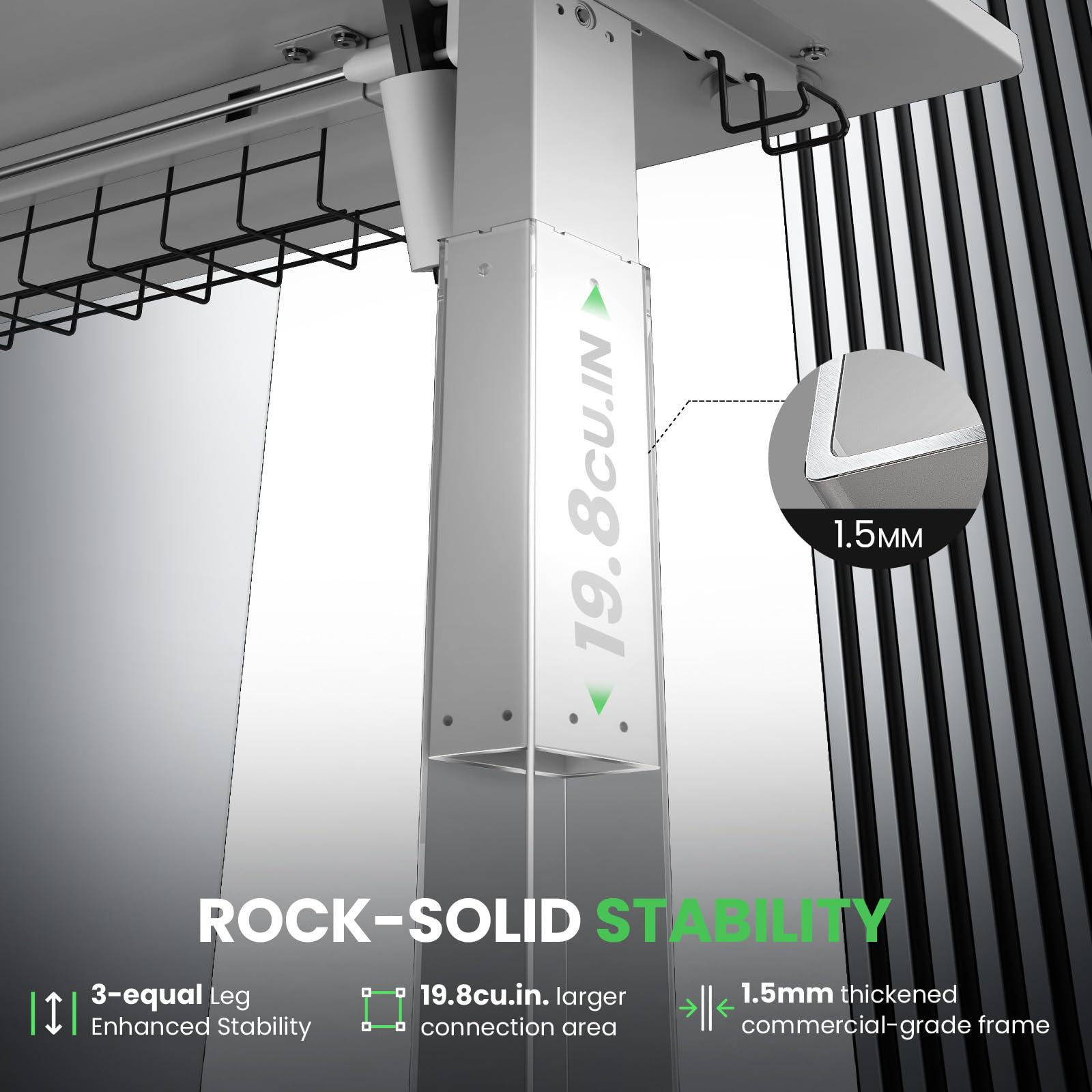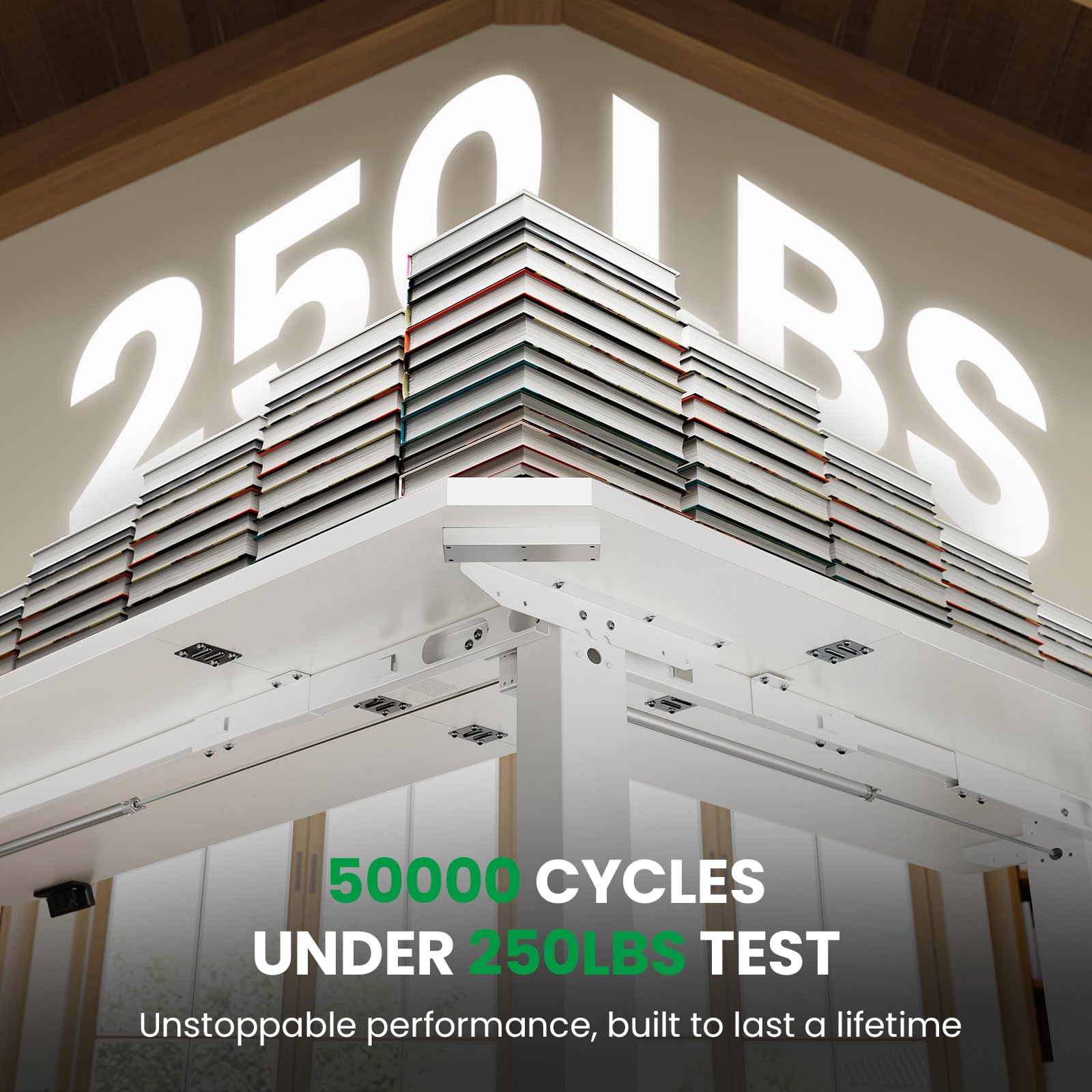 【Solid and Durable】The L-shaped electric standing desk features a durable and wear-resistant tabletop paired with three equal-length legs . During a 250LBs load-bearing test, the motor can smoothly perform 50,000 lifting and lowering cycles. SIAGO L-shaped standing desk — Redefining the lifecycle of office furniture through industrial-grade durability