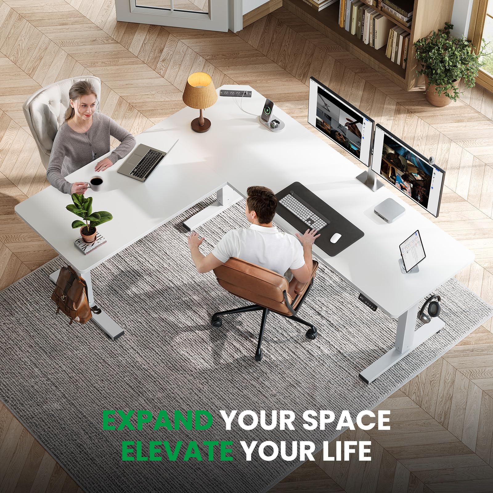 【Ample Workspace for Maximum Productivity】SIAGO 75"x63" L-shaped adjustable height desk is perfect for home office and gaming and multi-device work scenarios .This intelligent layout optimizes workspace efficiency by minimizing device switching and keeping all essentials within arm's reach, effectively streamlining your workflow.