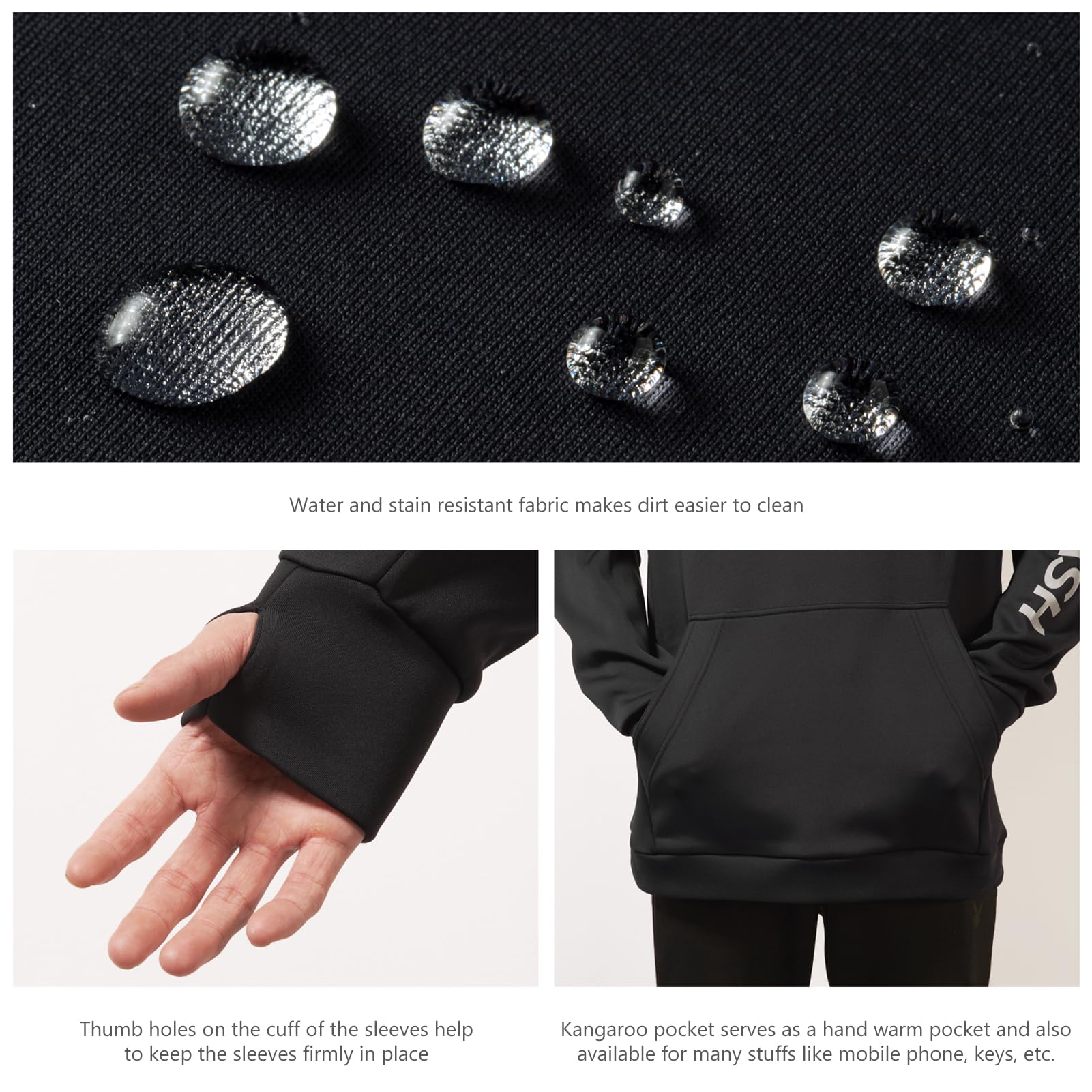 Big kangaroo pocket serves as a hand warm pocket and is also available for personal stuffs like mobile phone, keys, etc; Thumb holes on the sleeve cuffs help to keep the sleeves firmly in place