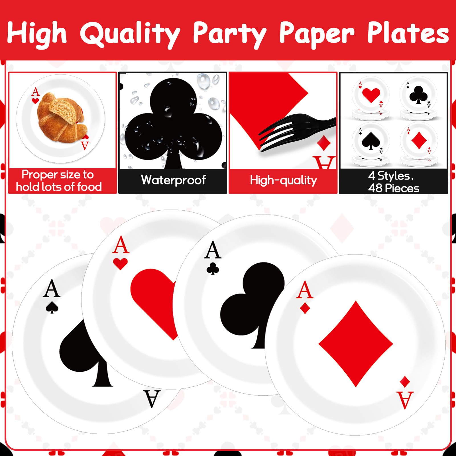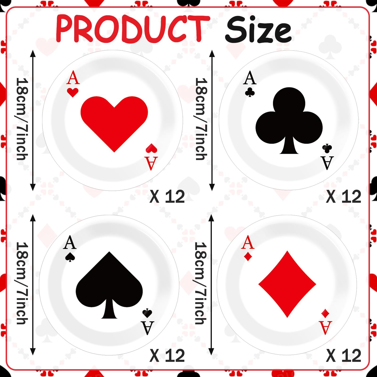 Package includes:This casino party supplies includes 48 paper plates (7")(18x18cm).The casino nigh party tableware can serve for 48 guests and decorating with it will make your party more enjoyable.