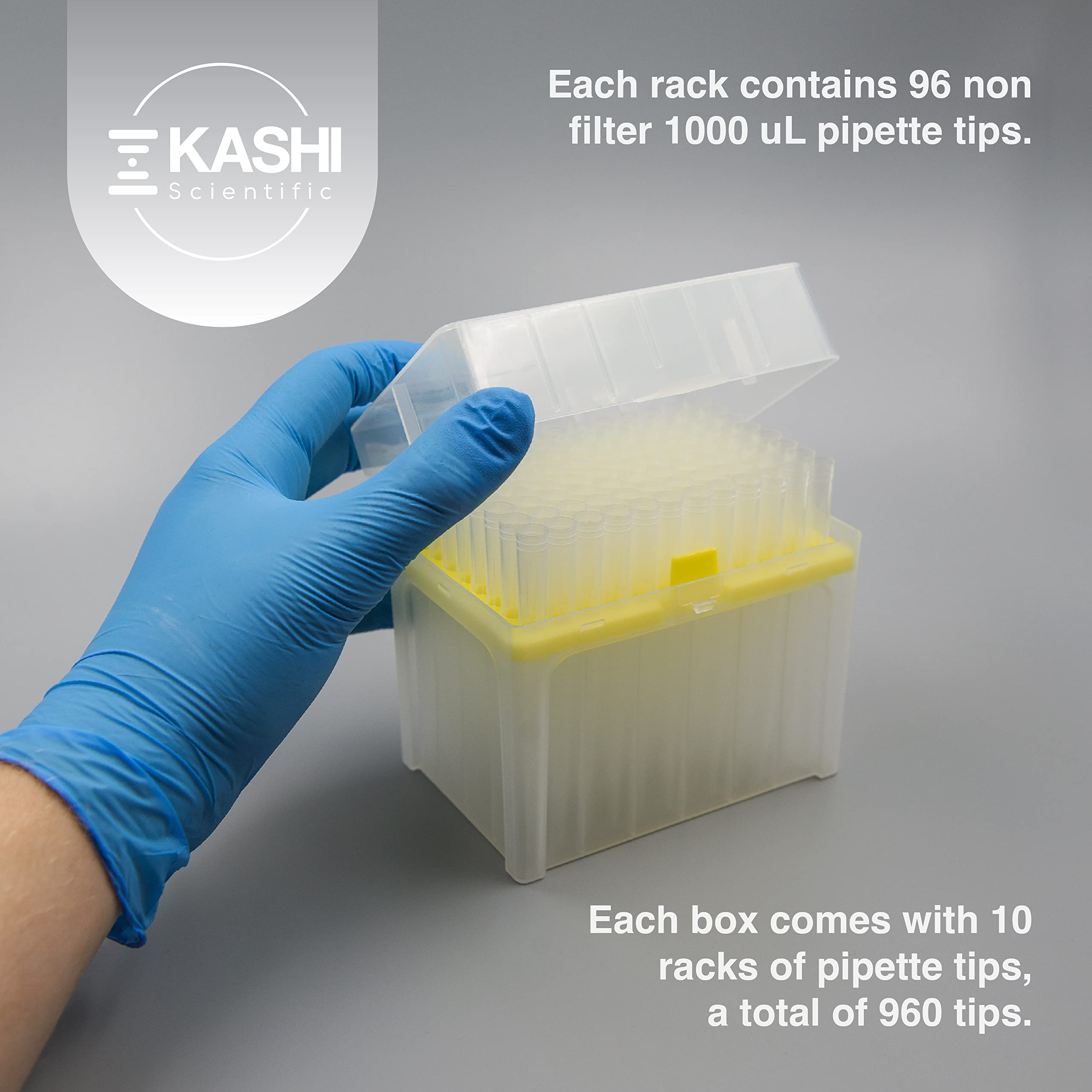 Durable polypropylene pipette tips are sterilized and individually wrapped in racks of 96 tips