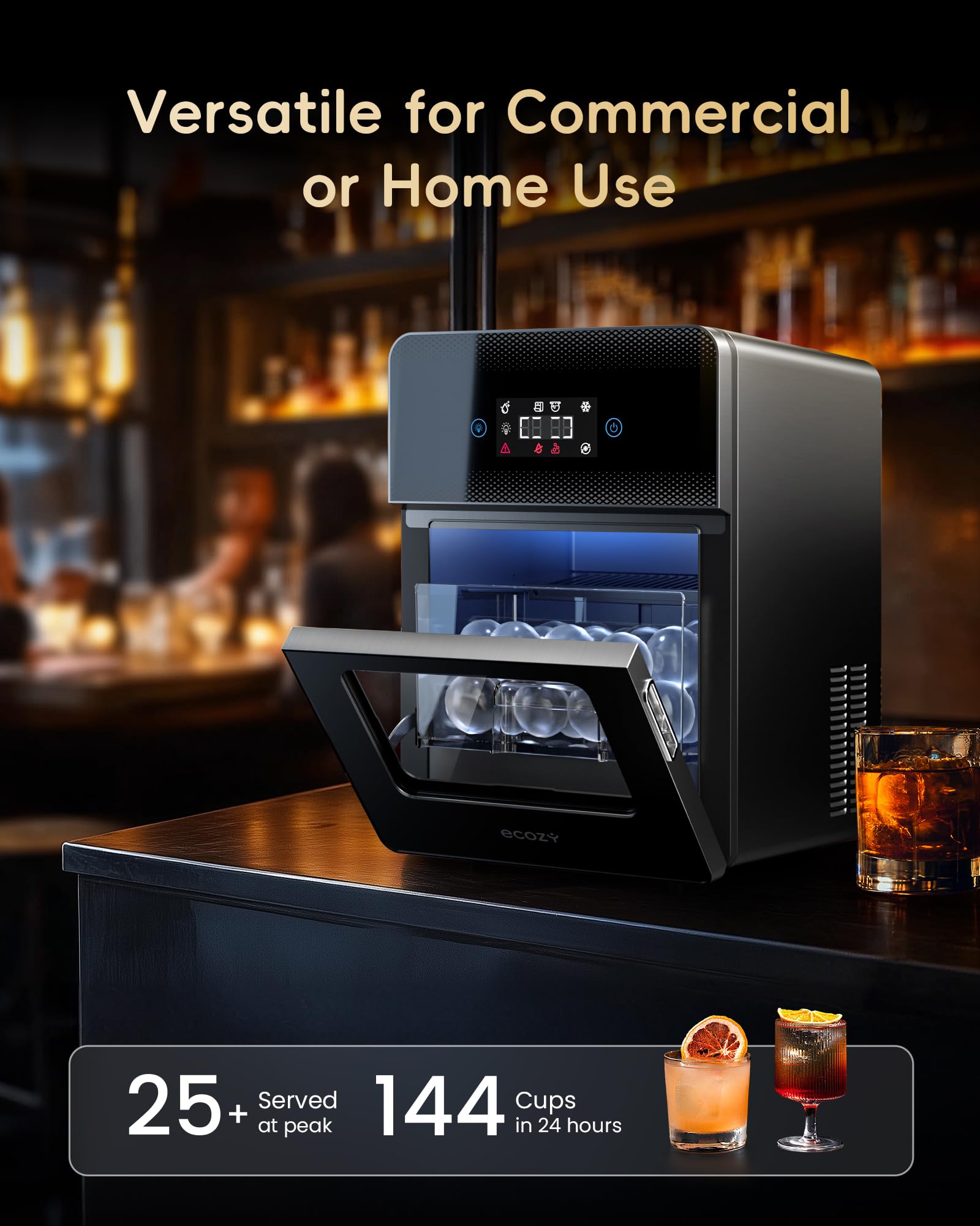 Ice Ball Always Ready, Easy to See: Produces 144 ice balls daily with storage for 56—perfect for bars serving 20–30 guests, ensuring a continuous supply. Built-in LED light makes level checks easy