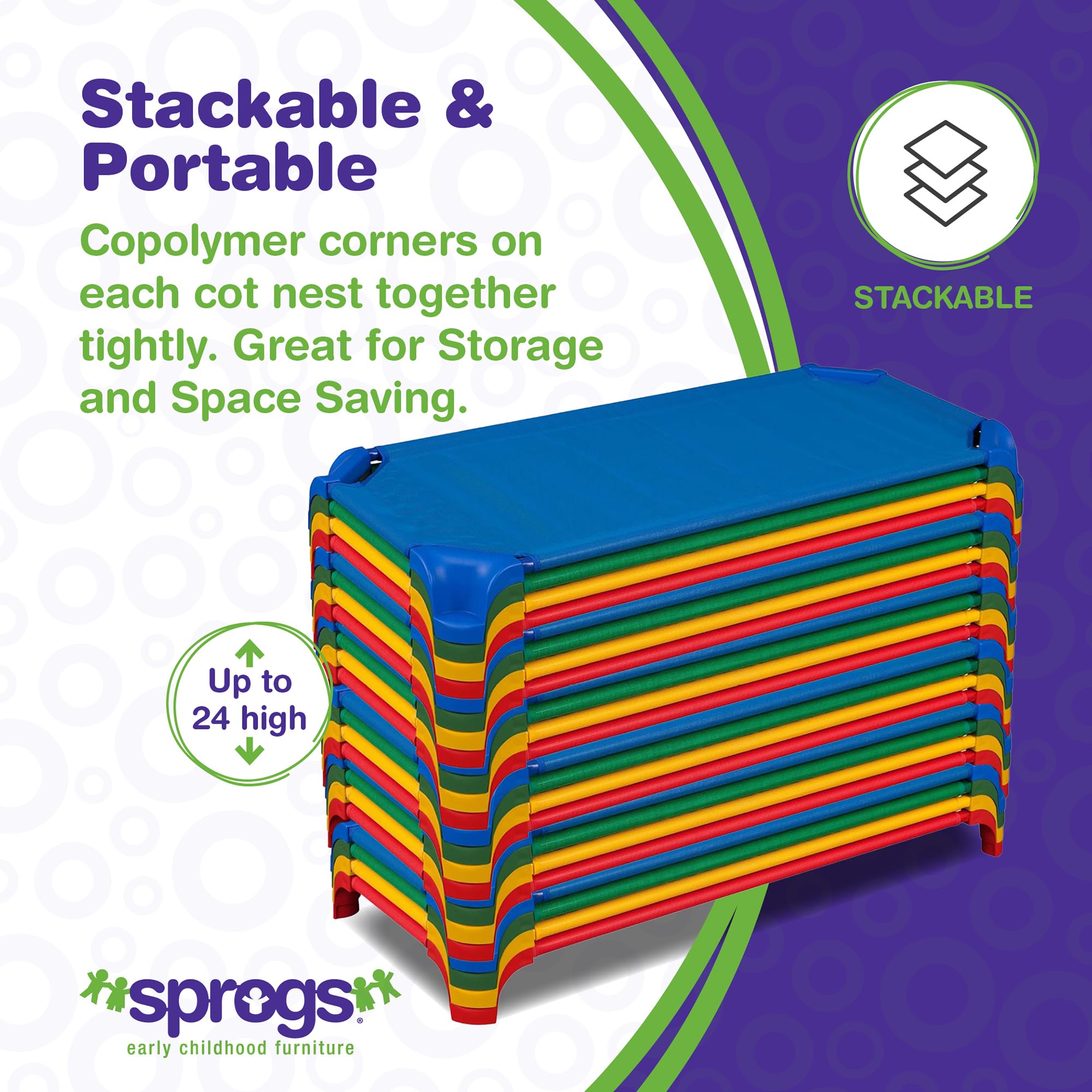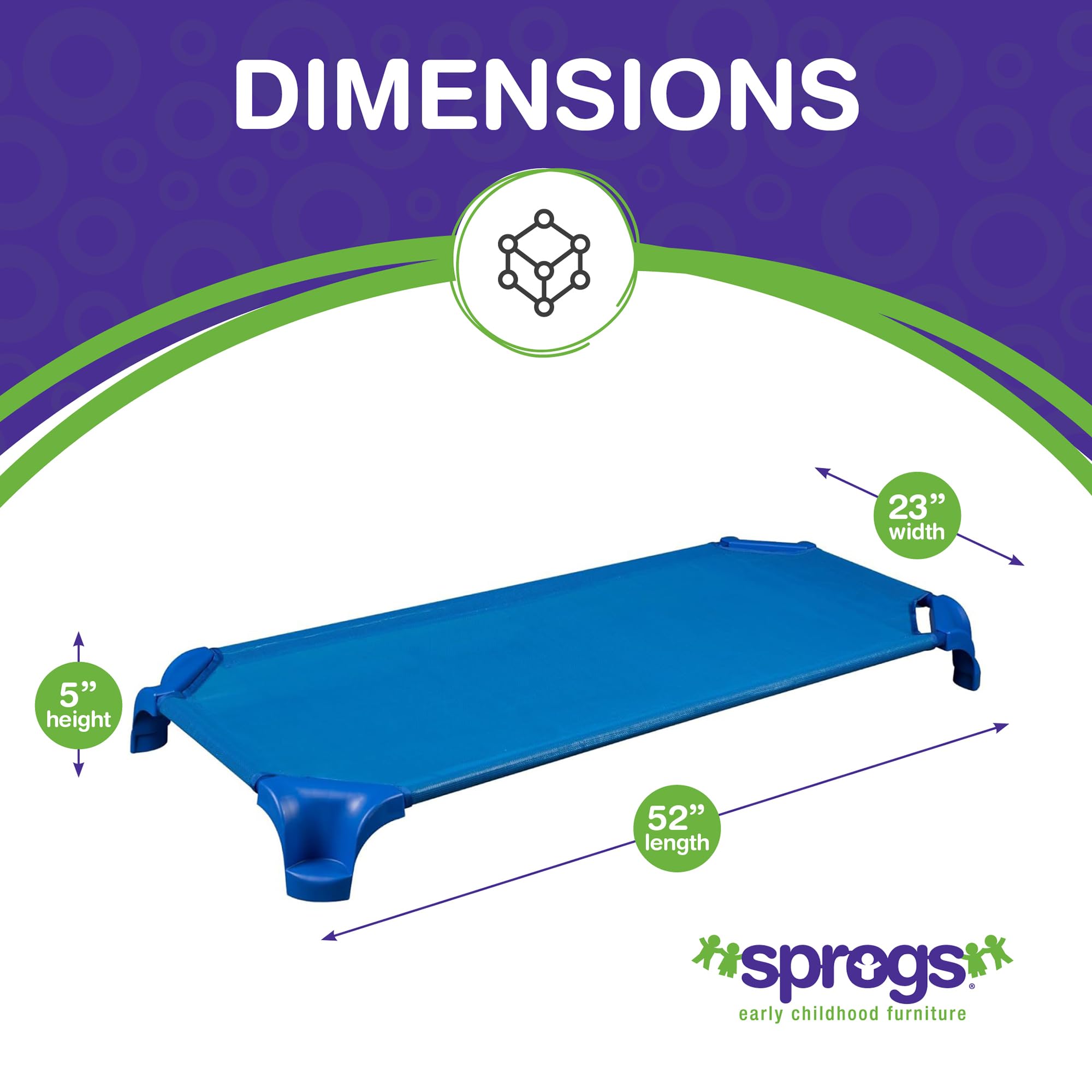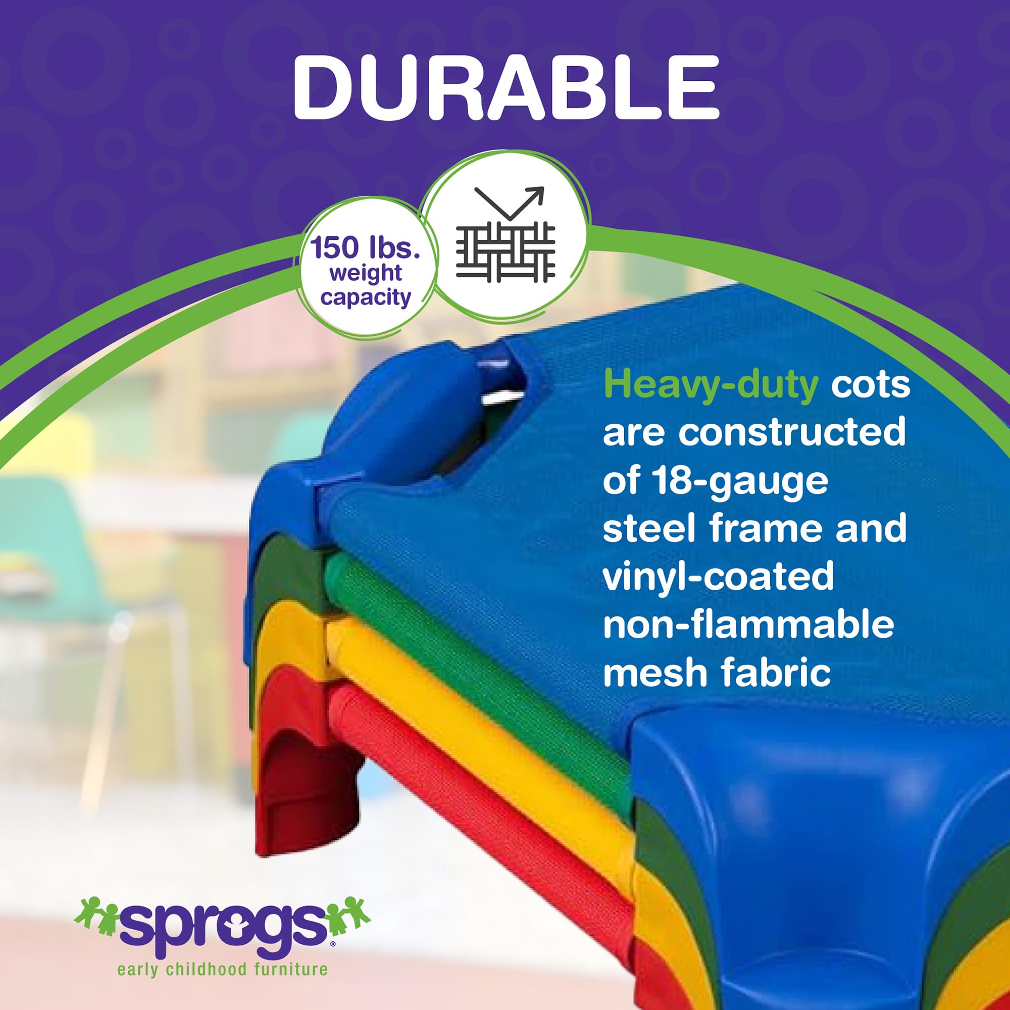 After long hours of play or learning, the Sprogs Stackable Daycare Cots provides your little ones with the perfect place to cozy up and relax for a safe nap. These child-friendly sleeping cots are designed with care to ensure a comfortable napping surface for preschoolers and sleepy toddlers, making them great for classrooms, daycare centers, or any room in your home. For optimal convenience in the classroom, the copolymer corners on each cot nest together tightly to allow you to neatly stack them up to 24 high for compact storage after nap time, and rolling casters (sold separately) can be attached to the bottom of the cots to simplify set up and clean up. The durable, non-flammable mesh fabric with a vinyl coating makes clean-ups a breeze - simply scrub the cot with a damp soapy sponge and wipe it dry. Constructed with a sturdy 18-gauge steel frame, these naptime cots withstand years of heavy-duty use and support up to 150 pounds, and they're backed by a 20-year warranty. Each Greenguard Gold Certified children's cot is easy to assemble and measures 52" L x 23"W x 5"H to fit neatly in classrooms or homes without taking up too much space.
