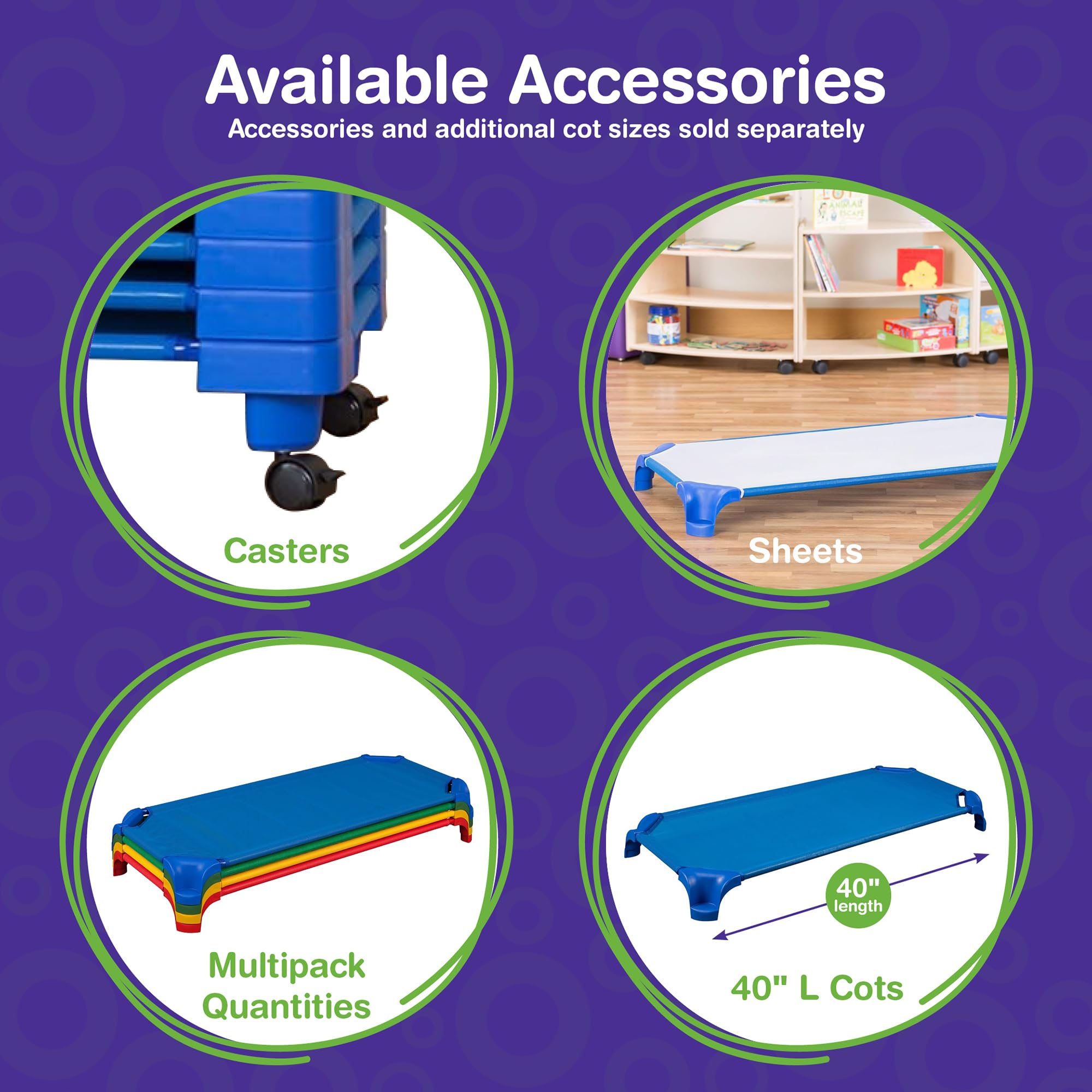 STACKABLE AND PORTABLE: Copolymer corners on each cot nest together tightly to allow you to neatly stack them up to 24 high, and rolling casters (sold separately) can be attached to the bottom of the cots to simplify set up and clean up