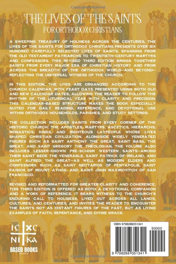 The Lives of the Saints for Orthodox Christians (Third Edition) This revised third edition has been completely reformatted and updated to follow the Church calendar, presenting the lives of the saints according to their feast days with both Old and New Calendar dates. This structure allows readers to follow the rhythm of the liturgical year directly, making the volume well suited for daily reading, reference, and devotional use. The Lives of the Saints for Orthodox Christians is a sweeping treasury of holiness across the centuries, presenting over six hundred carefully selected lives of saints, from the Old Testament patriarchs to twentieth-century martyrs and confessors. The collection spans the full breadth of Orthodox Christian history, drawing together saints from every major era of the Church and from across the historic Christian world. Organized according to the Church calendar, the book includes apostles, martyrs, hierarchs, monastics, rulers, and righteous laypeople whose lives shaped Christian faith and culture. Widely venerated figures such as Saint Anthony the Great, Saint Basil the Great, and Saint Gregory the Theologian appear alongside lesser-known pre-schism Western saints, including Saint Bede the Venerable, Saint Patrick of Ireland, and Saint Alfred the Great. The volume also includes modern saints and elders such as Saint Nectarios of Pentapolis, Saint Paisios of Mount Athos, and Saint John Maximovitch of San Francisco. Special attention is given to saints of the English-speaking world and the Orthodox Christian presence in the Americas, as well as to elders and martyrs of Mount Athos and other centers of Orthodox spiritual life. Each life is presented with clarity and reverence, emphasizing faith, repentance, perseverance, and the working of divine grace within concrete historical circumstances. The lives included in this volume have been carefully compiled and cross-checked against trusted Orthodox sources, including The Lives of the Saints by Saint Demetrius of Rostov, The Prologue of Ohrid by Saint Nikolai Velimirovich, and other traditional hagiographical and ecclesiastical texts. This approach ensures fidelity to the Church’s received memory of the saints while presenting their lives with consistency and accessibility for contemporary readers. Revised for coherence and ease of use, this third edition is offered as both a devotional companion and a work of reference. The Lives of the Saints for Orthodox Christians bears witness to the Church’s enduring call to holiness—lived out across all lands, cultures, and centuries—and invites readers to encounter the saints not as distant figures of the past, but as living examples of Orthodox Christian life.
