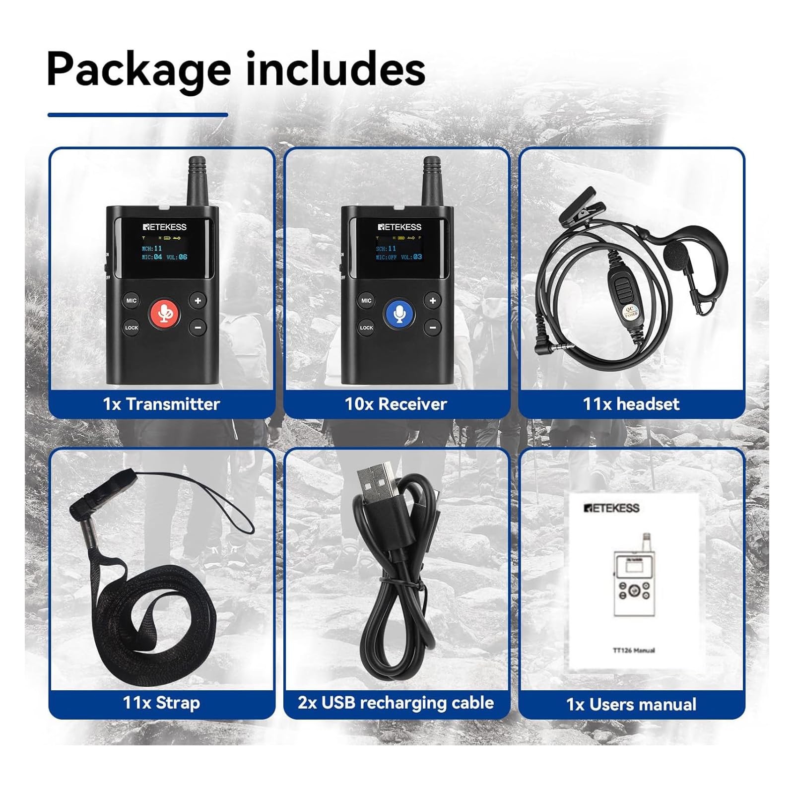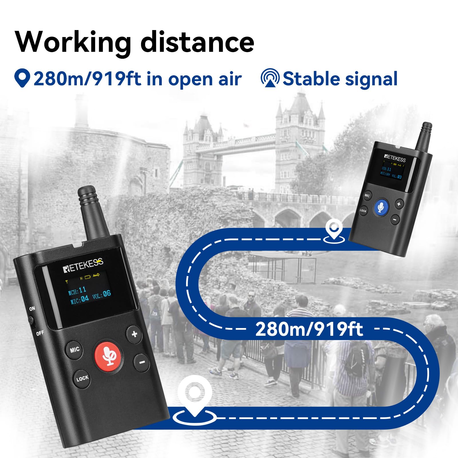 Long communication distance; Retekess TT126 two way tour guide system transmission distance of the wireless communication system is about 280m/919ft in open air; make sure you are in barrier-free transmission environment