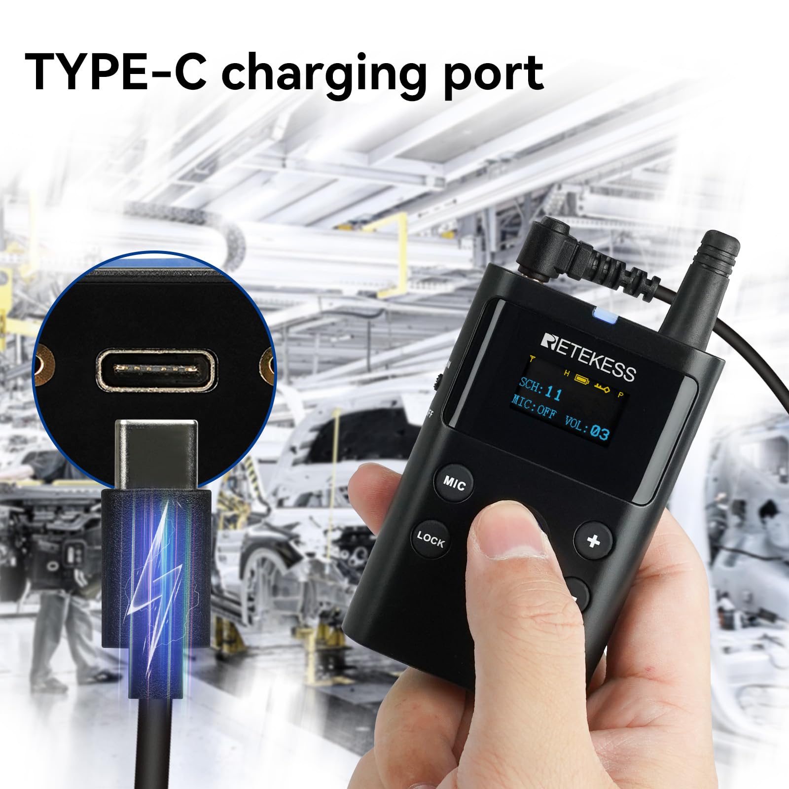 Retekess TT126 two-way communication equipment is fully charged; the transmitter can work for 10 hours and the receiver can work for 10-70 hours; there is no need to worry about battery problems and you can enjoy a complete factory tour
