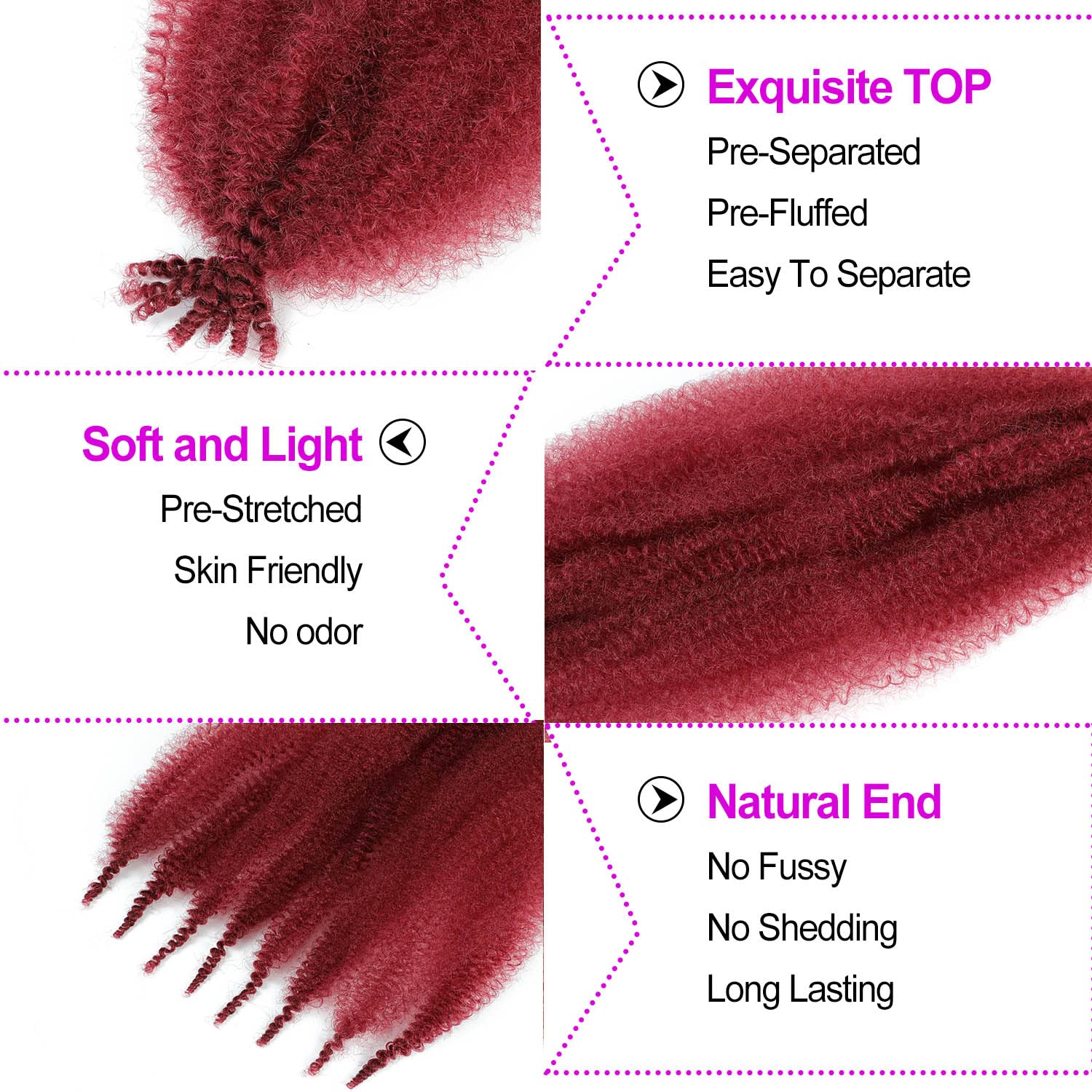 1. Hair Material: Pre-separated springy afro twist hair made of high quality low temperature fiber. Our spring afro twist hair boasts more density and natural looking, soft and fluffy, no smell, friendly to skin