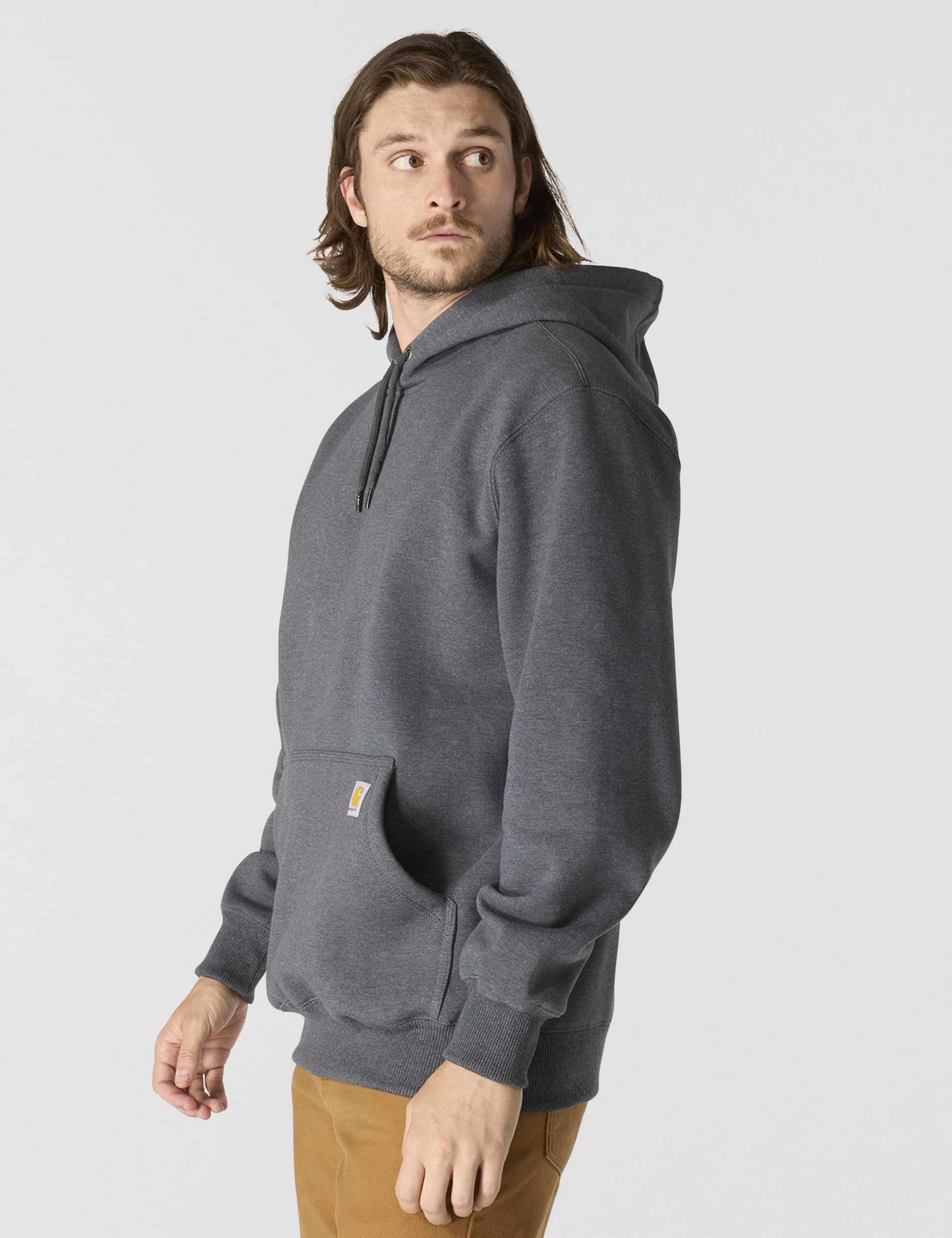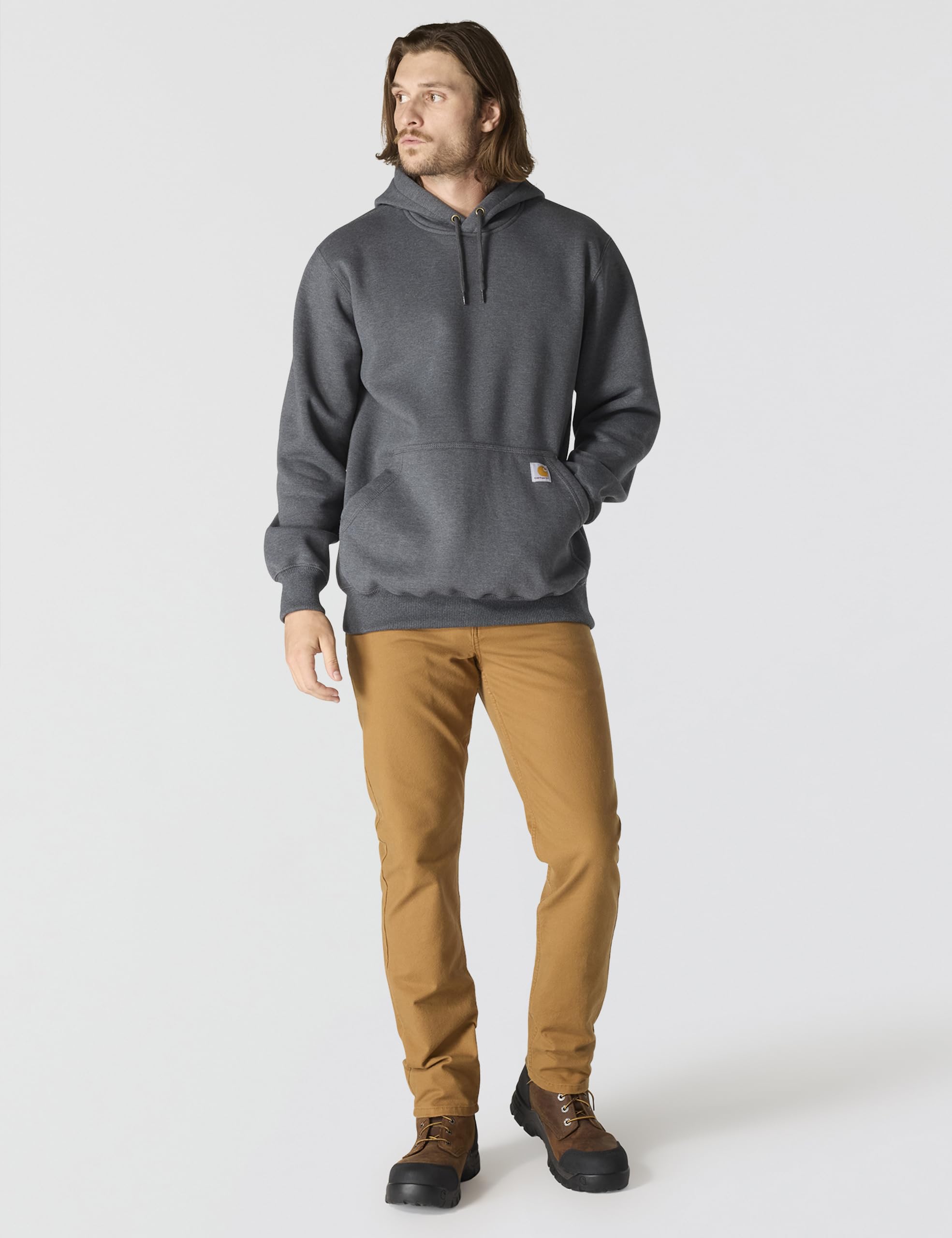 Description This men's hoodie offers the warmth and comfort of a heavyweight sweatshirt with the added weather protection of Carhartt's Rain Defender® water-repellency to keep you dry in damp weather. It features a thick cotton blend, and a loose fit allows for easy layering and movement.