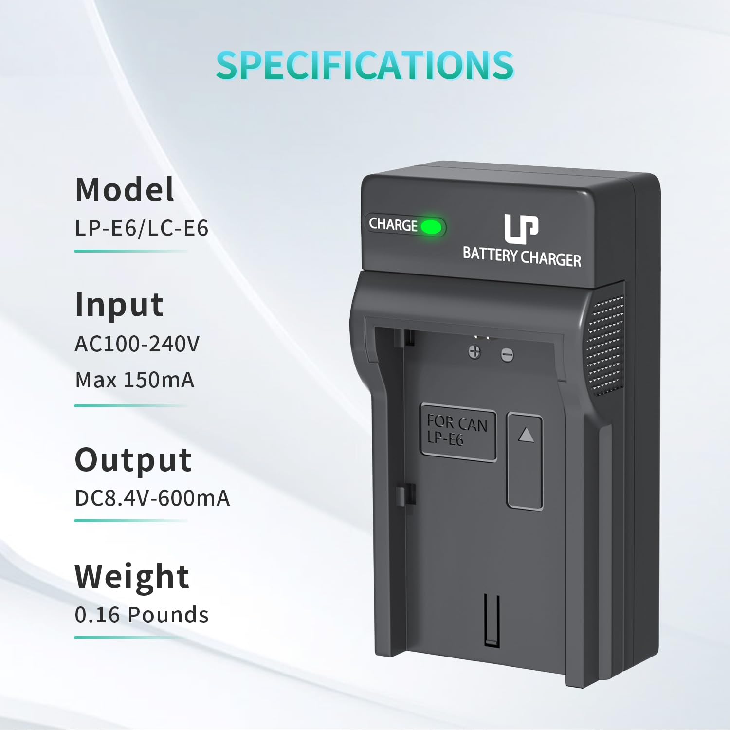 WORLDWIDE USE: Input - AC100-240V, output - DC8.4V 600mA. Can be used to charge your LP-E6, LP-E6N Battery in any country.