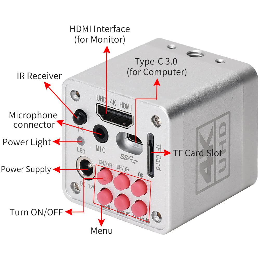 This is high speed 4K video microscope camera for both HDMI output and USB output. Plus the USB output via type c plug provides high speed signal transaction. It is 4K @30fps, 1080P@60fps via HDMI ouptut. 3840x2160@30fps via USB output.