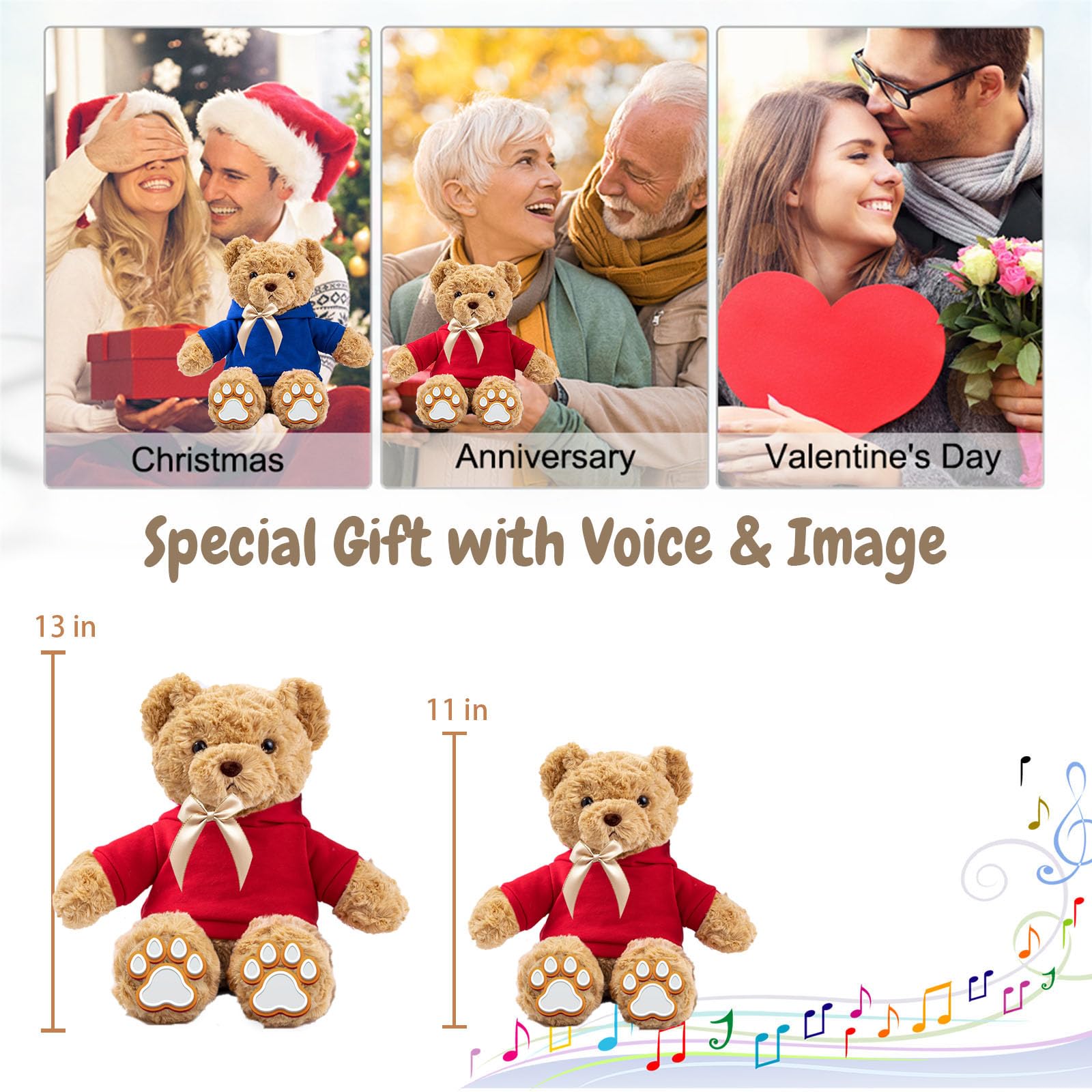 【Good Quality Stuffed Material】 Made of soft fabrics and filled with good quality material, our teddy bear with voice recording is handy and comfortable and the shapes are designed by professional designers and produced by skilled workers to ensure that your custom text photo is accurately printed. Also, it's available in multiple color and sizes. With bright eyes and very cute expression, the customized teddy bear stuffed animal symbolizes bravery, wisdom and confidence