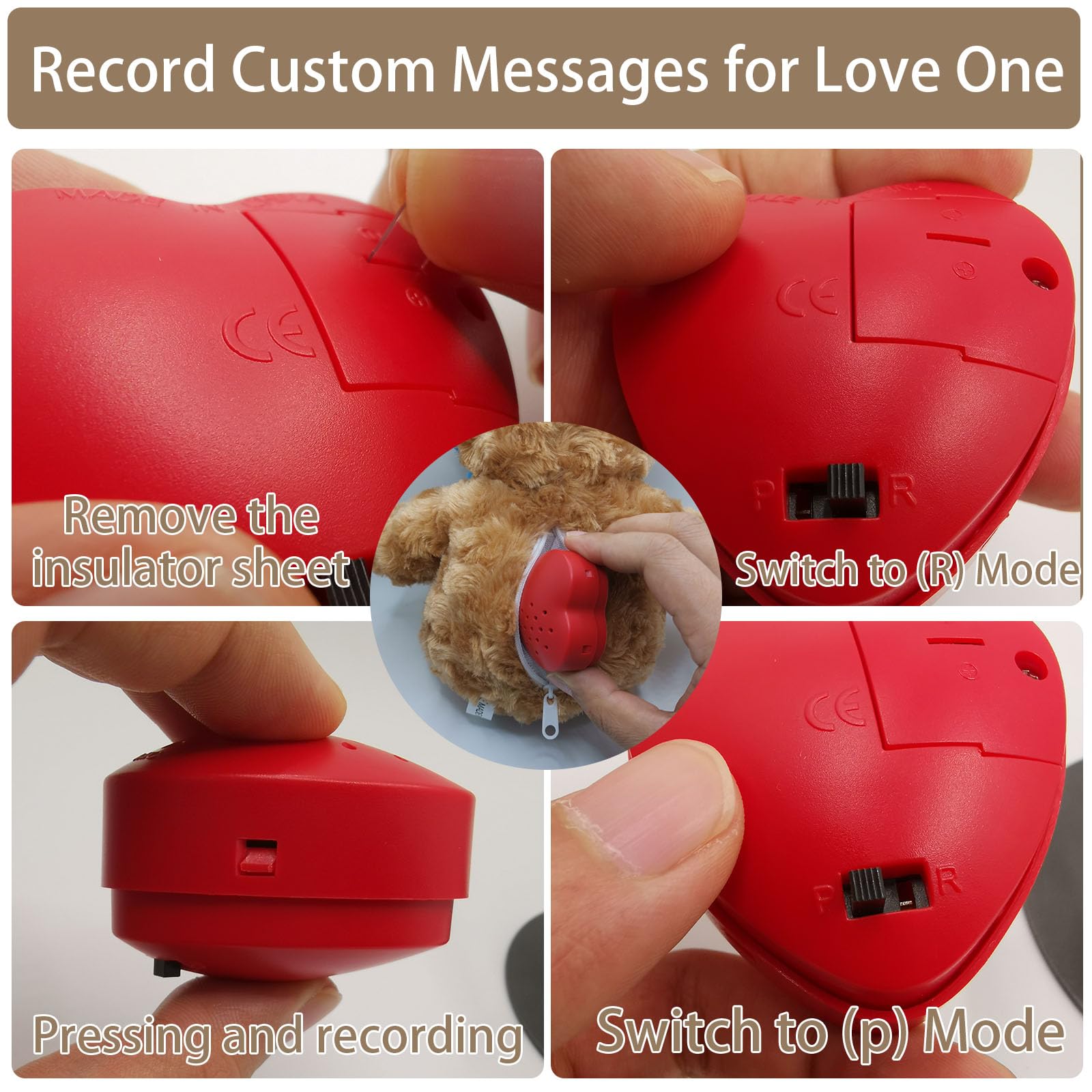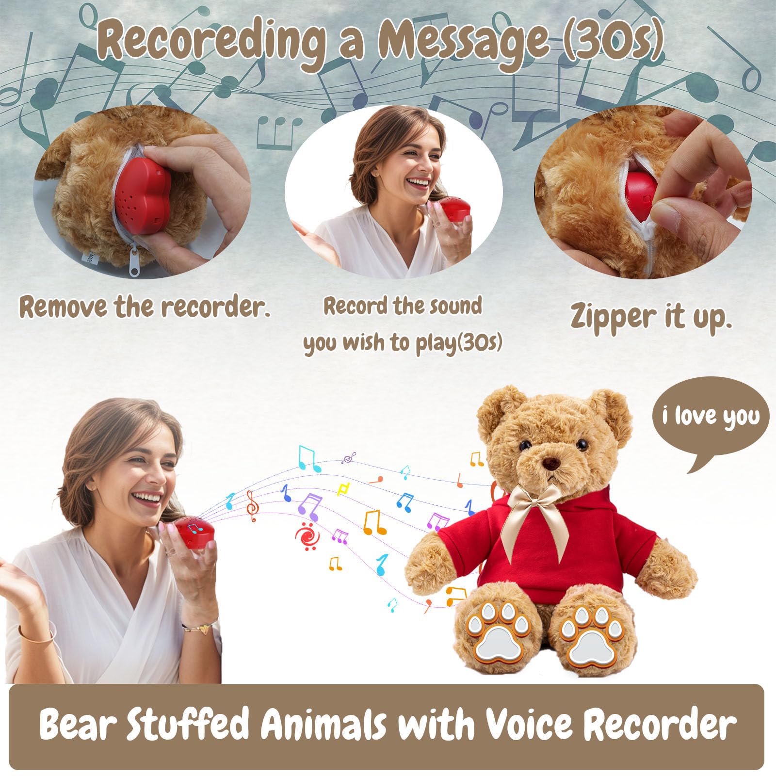 【Personalized Gifts Teddy Bear with Voice Recording】 Our Teddy Bear's editable quality allows you to add anything on its clothes, a name, a school logo, or your favorite photo. And it's very easy to use the Voice Recorder. 1. Slide the switch into record mode. 2. Squeeze heart to start recording. 3. Speak into mic for up to 30 seconds. 4. Release heart to stop recording. 5. Slide the switch into playback mode. 6. Squeeze heart to listen