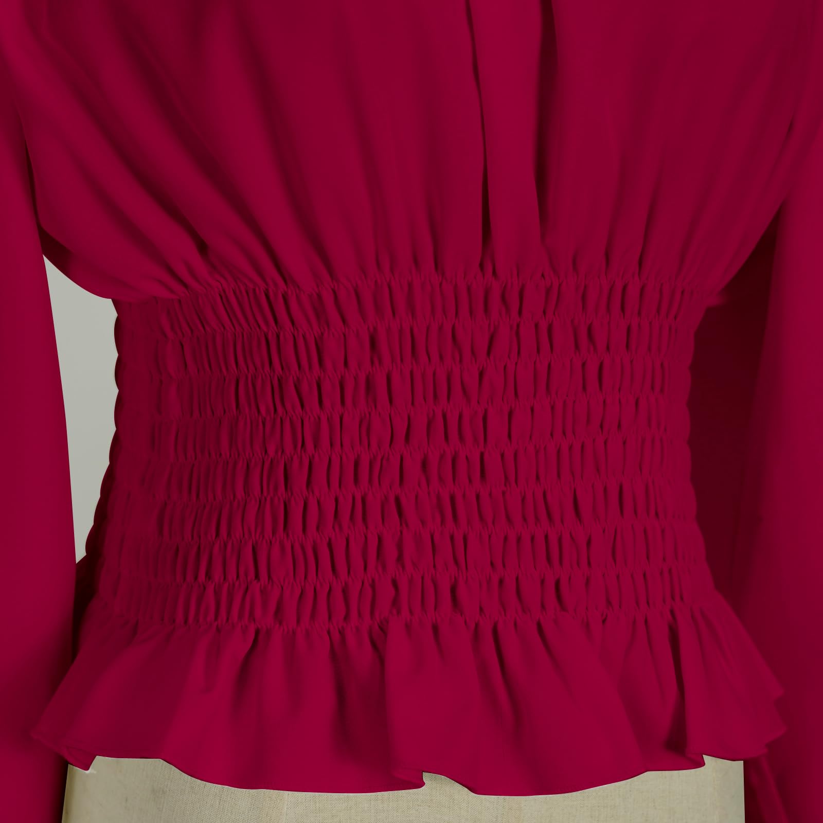 Please note that this is a high-waisted corset-style peasant blouse. Be sure to pay attention to the length of the garment before purchasing.