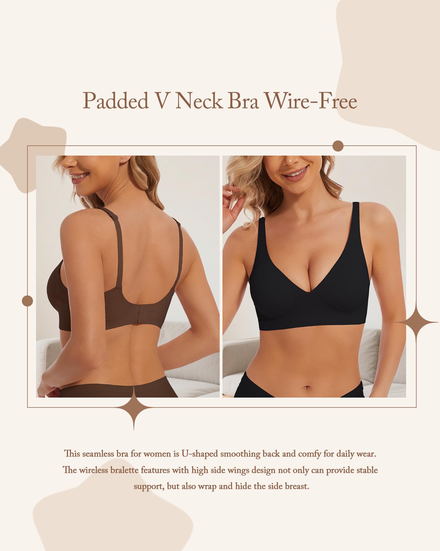 [Versatile Occasion & All Match - Bralettes for Women]: This wireless bra is an ideal choice for date, prom, party, home and casual daily match; wearing our v neck bra under top, t-shirt or dress, enjoy a seamless look that will complement any outfit