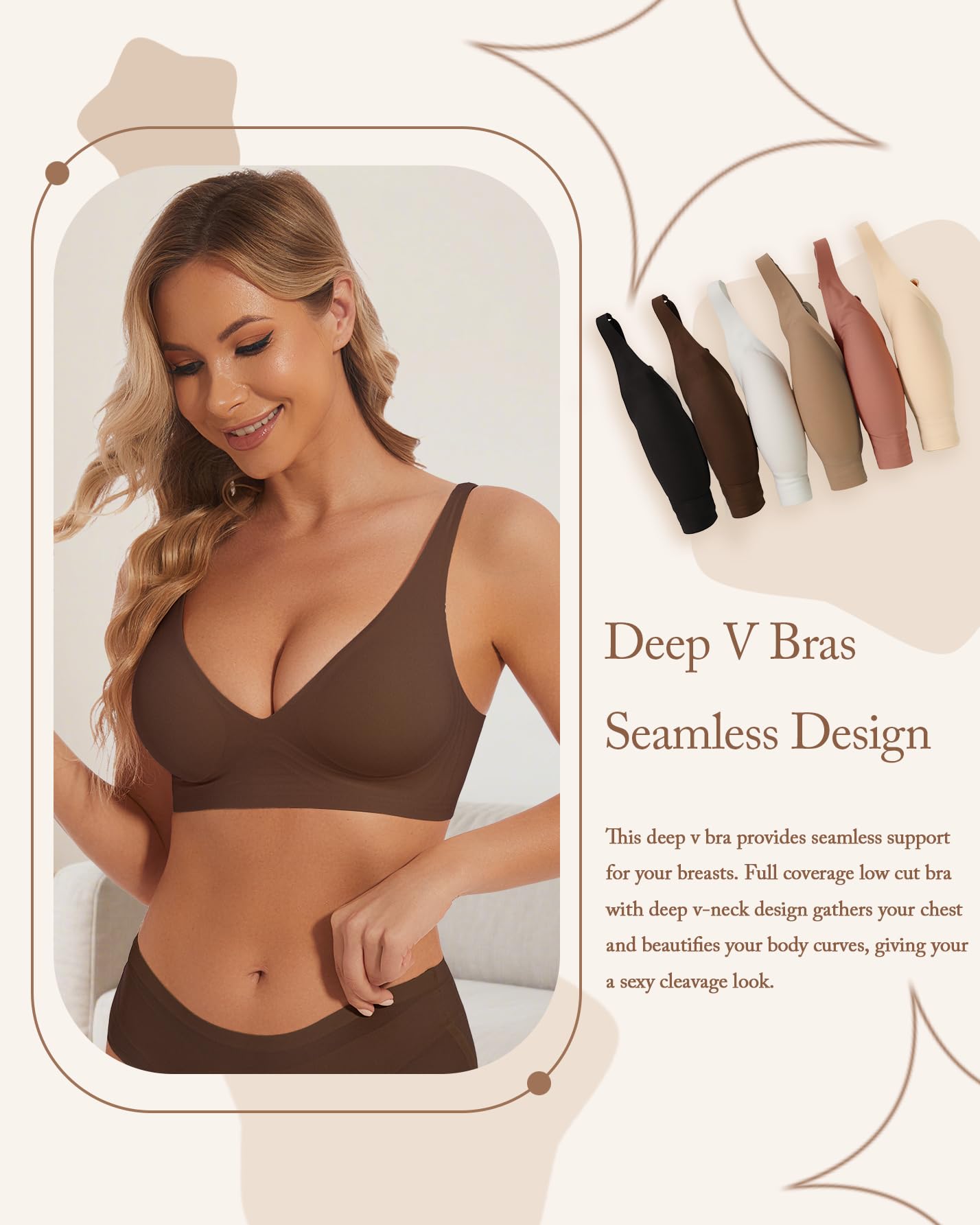 [Low Cut Bra for Deep V Neck - Slightly Push Up Effect]: This low cut bra provides seamless support for your breasts; full coverage bra with deep V-neck design gathers your chest and beautifies your body curves, giving you sexy cleavage look