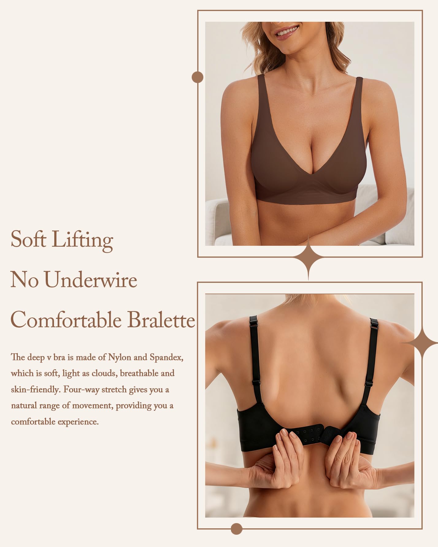[Smooth & High Elastic Fabric - For All Day Comfort]: The deep v bra is made of Nylon and Spandex, which is soft, light as clouds, breathable and skin-friendly; four-way stretch gives you a great extension, provides you a comfortable wearing experience