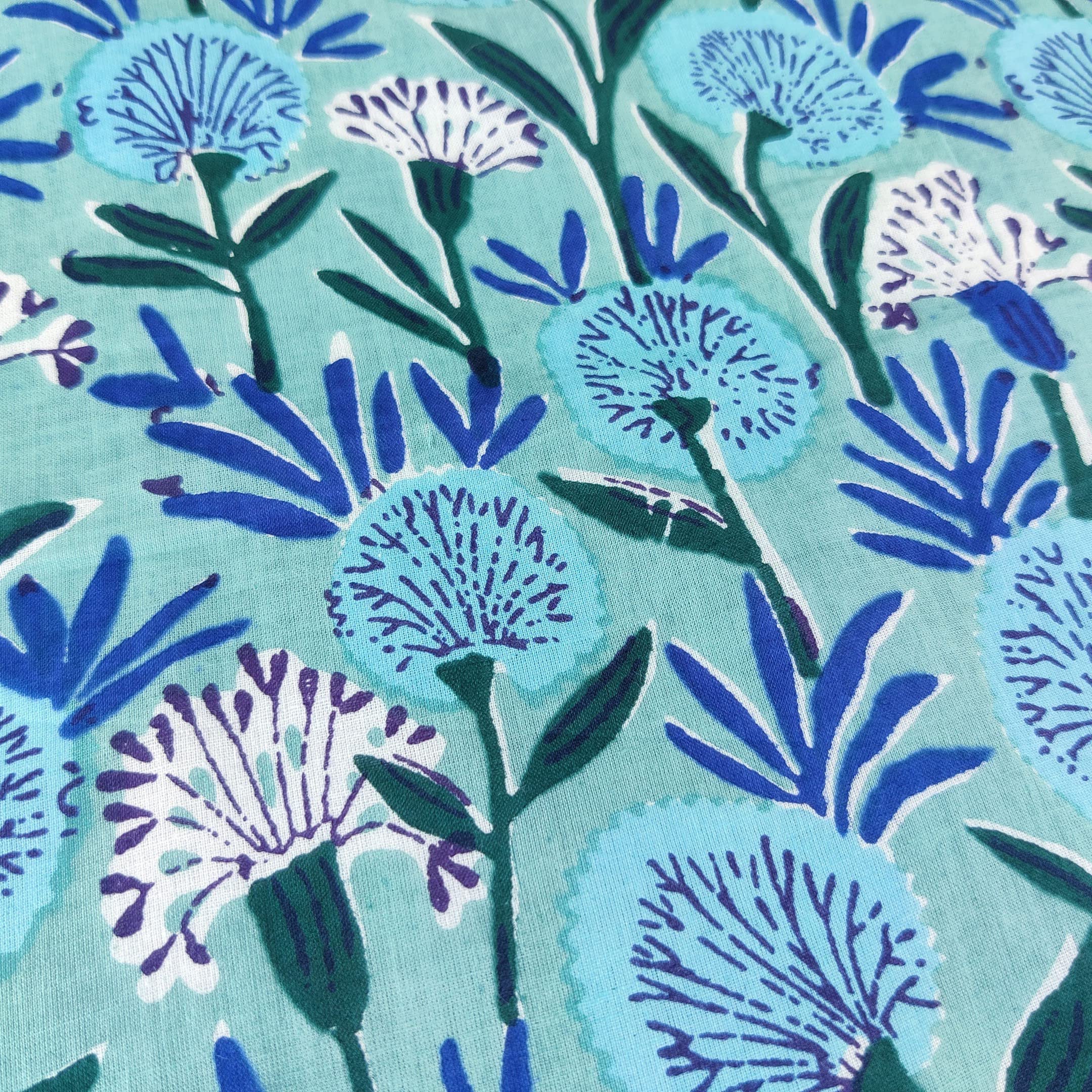 This is a hand printed fabric using wooden blocks or screens.