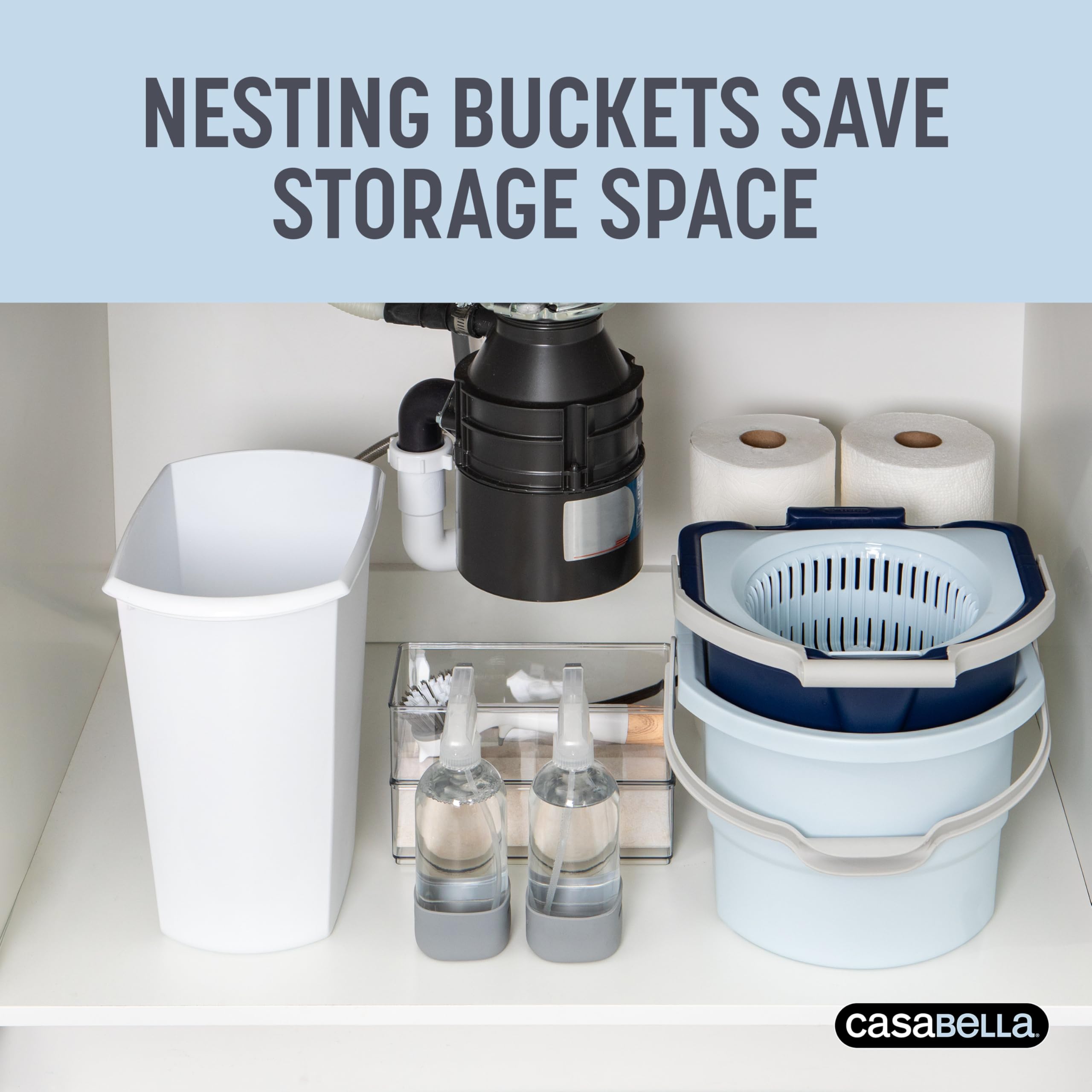 Keep your home clean and tidy with the Casabella Clean Water Spin Mop Set. Featuring 2 large buckets that work together, this spin mop system allows you to separate clean water from dirty water for easy and efficient mopping around the entire home. The easy-to-use pedal spinner and spinning handle make wringing the mop a breeze, and the bucket handles combine to offer a firm, comfortable hold for easy transportation. Designed for an optimal cleaning performance, the super absorbent microfiber mop head removes 99% of bacteria with just clean water, and the mop head's unique hex design effortlessly fits into corners for a thorough clean every time. The removable splash guard and integrated scraping tool provide additional convenience during both small and heavy-duty cleaning jobs. With the helpful built-in cleaning solution measuring cup, you can ensure correct ratios every time to save on cleaning solution, and the visible max fill line holds up to 1.25 gallons of solution.