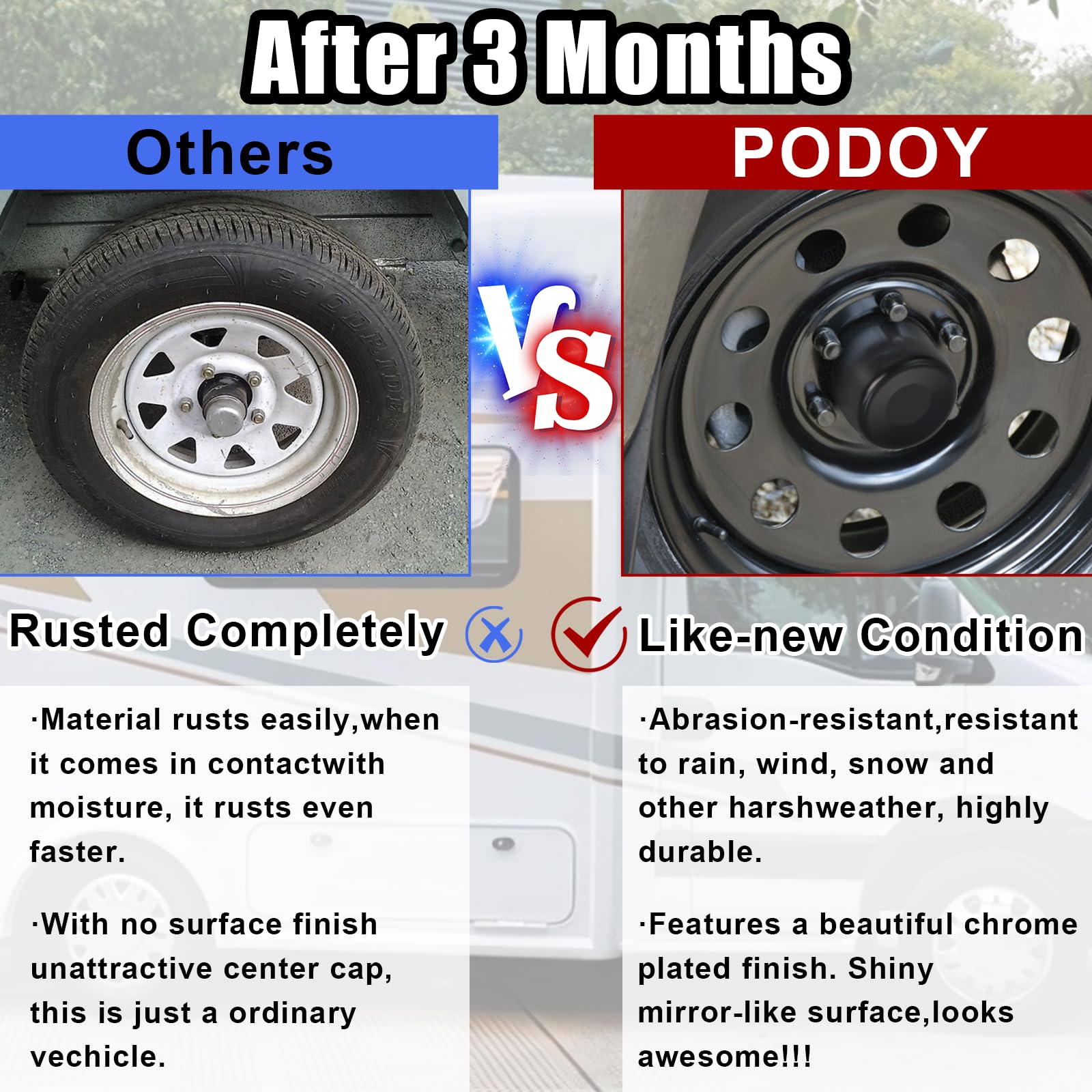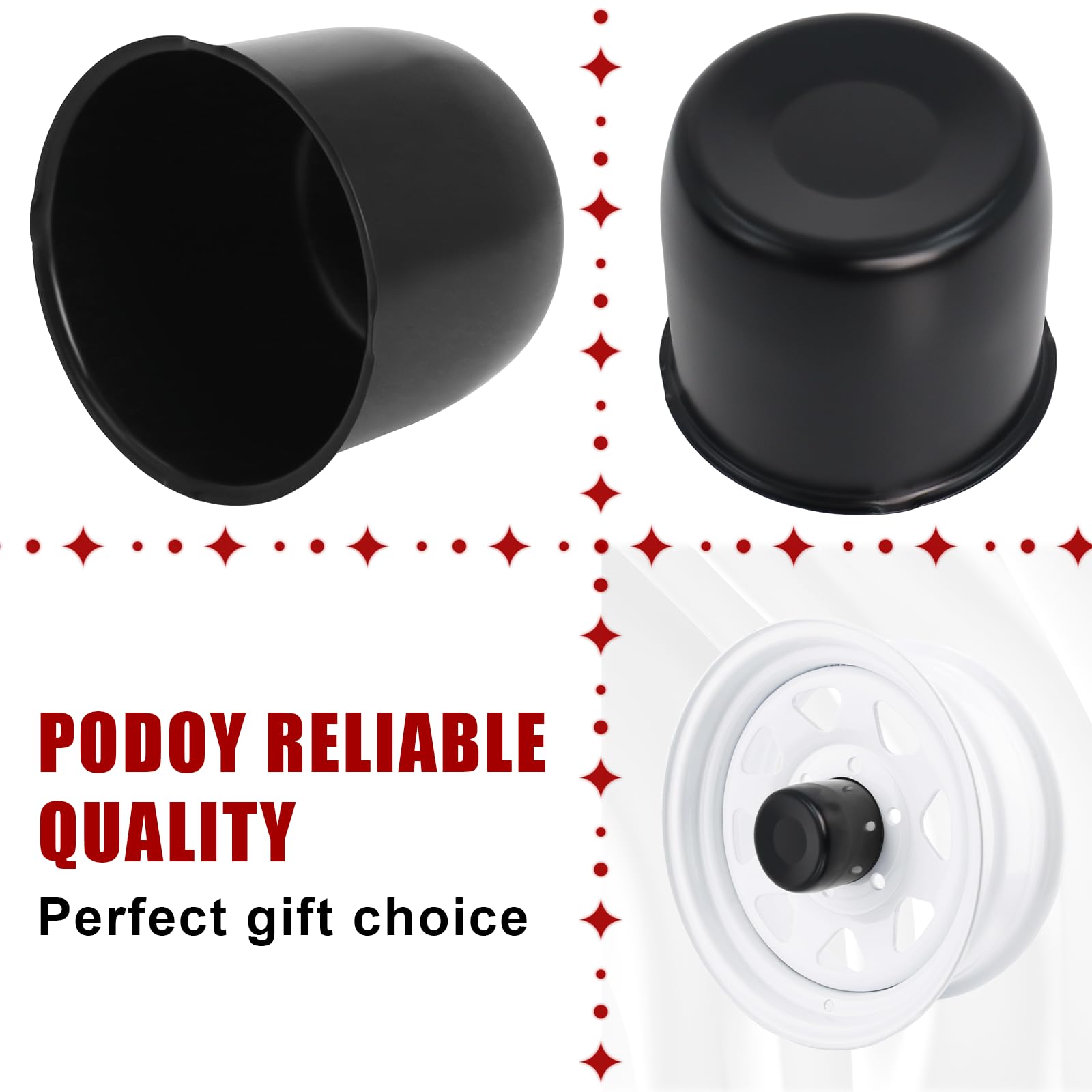 PREMIUM CENTER CAPS: Podoy push-through wheel center caps are made from high-quality carbon steel. They are scratch-resistant, solid, and durable, ensuring long-lasting performance. These caps are securely designed to stay in place and not easily fall off.