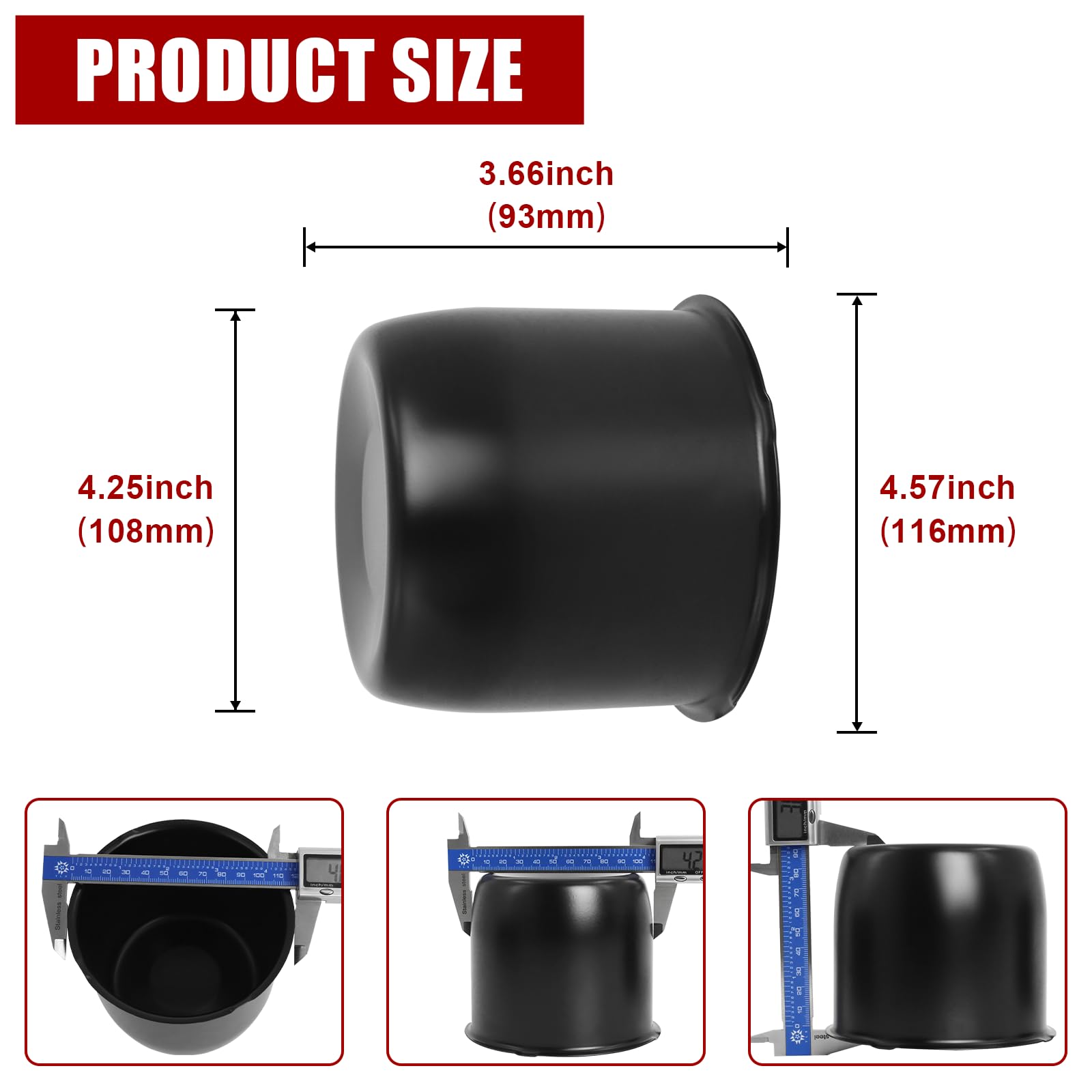 ACCURATE DIMENSIONS: The outer diameter is 4.25" (with the bottom lip 4.57"), and total height 3.66". These precise measurements ensure a perfect fit for your wheels, so you don’t have to worry about compatibility issues.