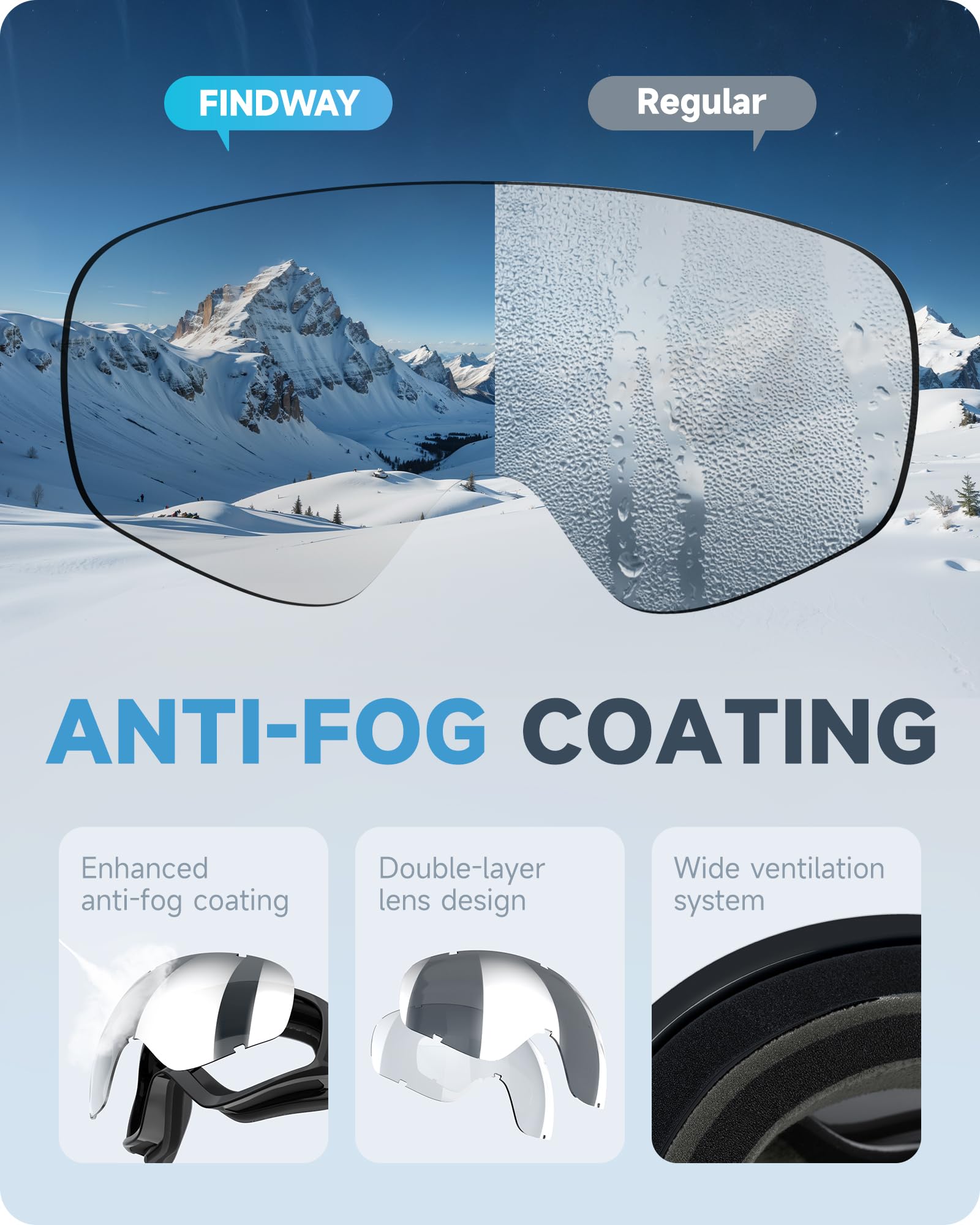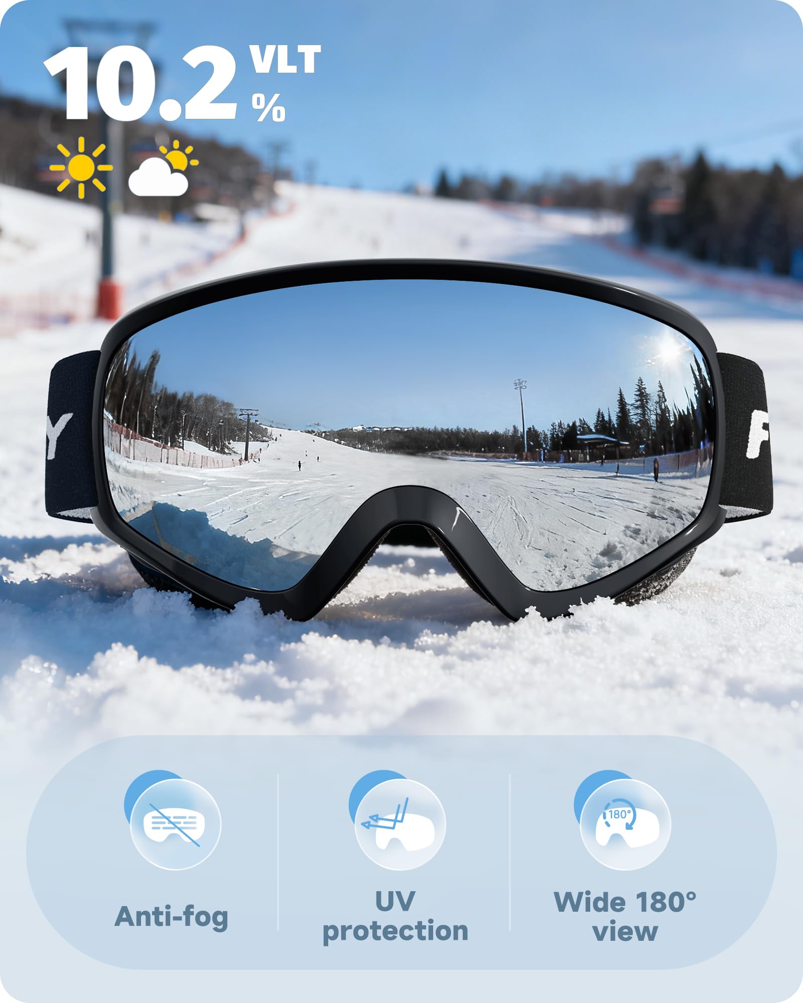 【Anti-fog & 100% UV400 Protection】Anti-fog ski goggles with UV400 protection adopt high performance double-layer lens to prevent fogging and protect your eyes from the glare, providing you with excellent clear vision and protecting your eyes from harmful sun rays. The super-hardening outer lens can improve anti-scratch performance.