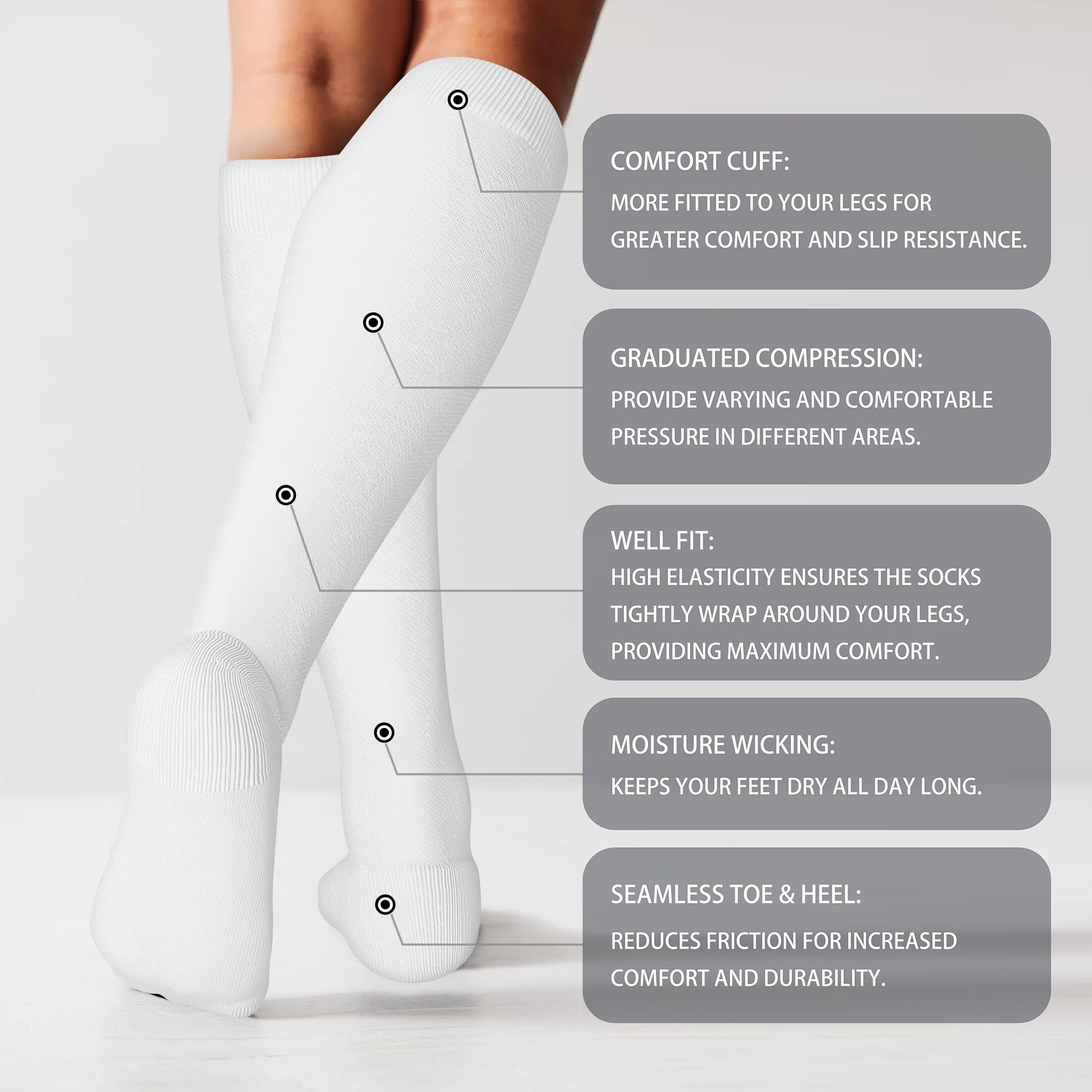 Graduated Compression Socks: Compression socks 20-30mmHg knee high provide comfortable and appropriate pressure from the ankle to the calf, effectively promoting blood circulation in the legs, caring for your leg health, and keeping you comfortable all day long.