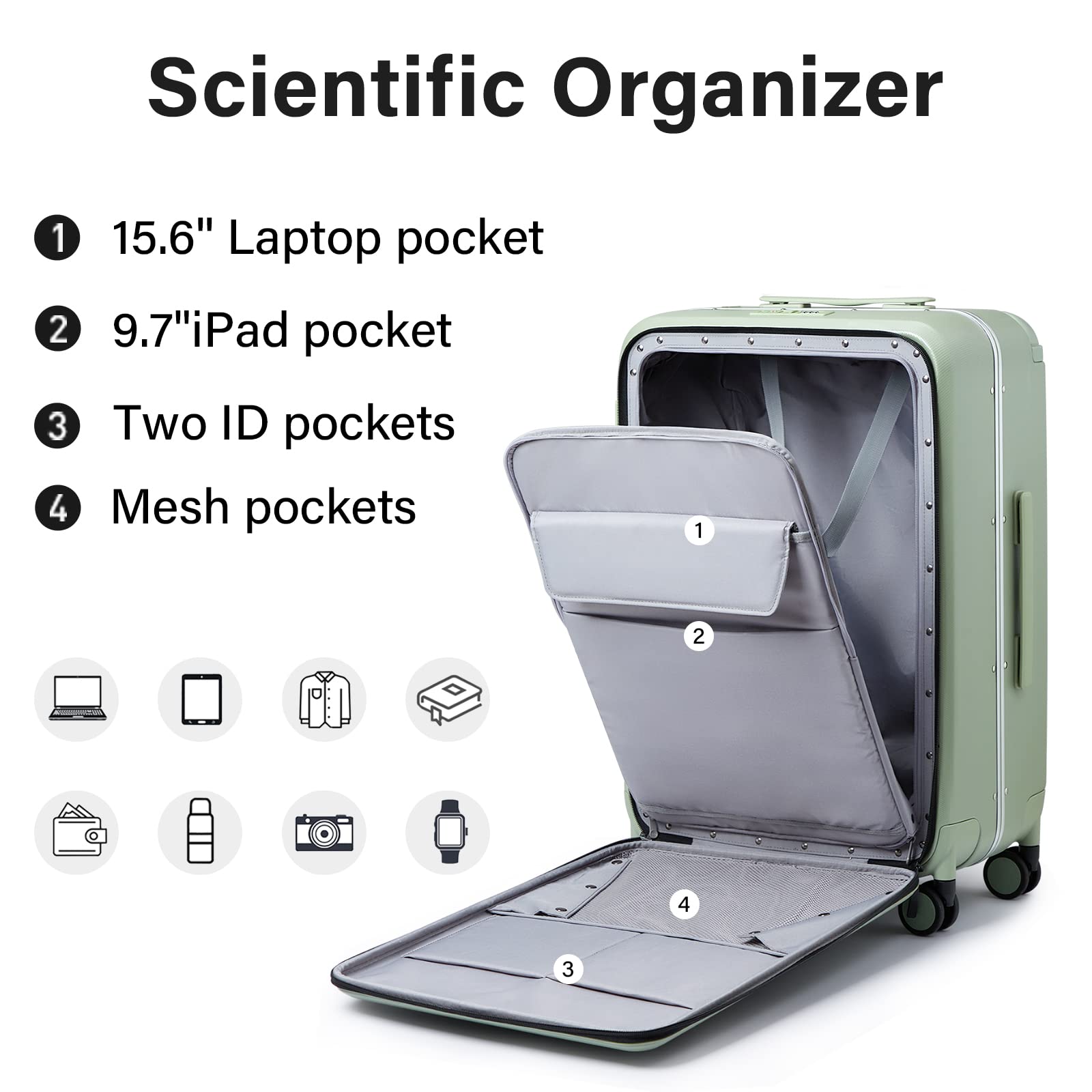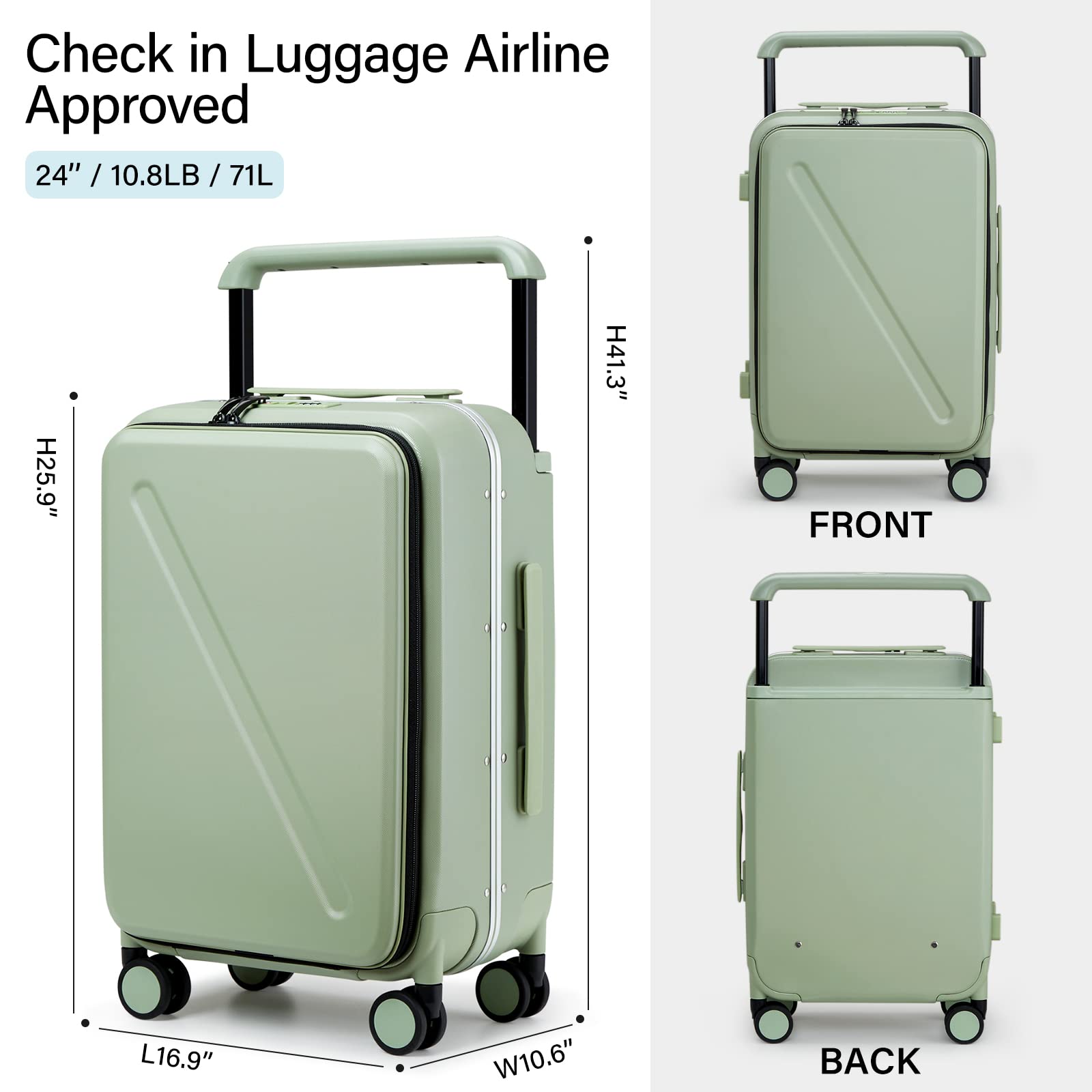 【Fastly Opening Front Compartment】Our wide handle checked luggage with front pocket choice hard side feature with a front compartment for 15.6" laptop, so it would be easier to go through security at the airport. And you can zipper it open quickly to get your laptop or electronics in and out at any time and where