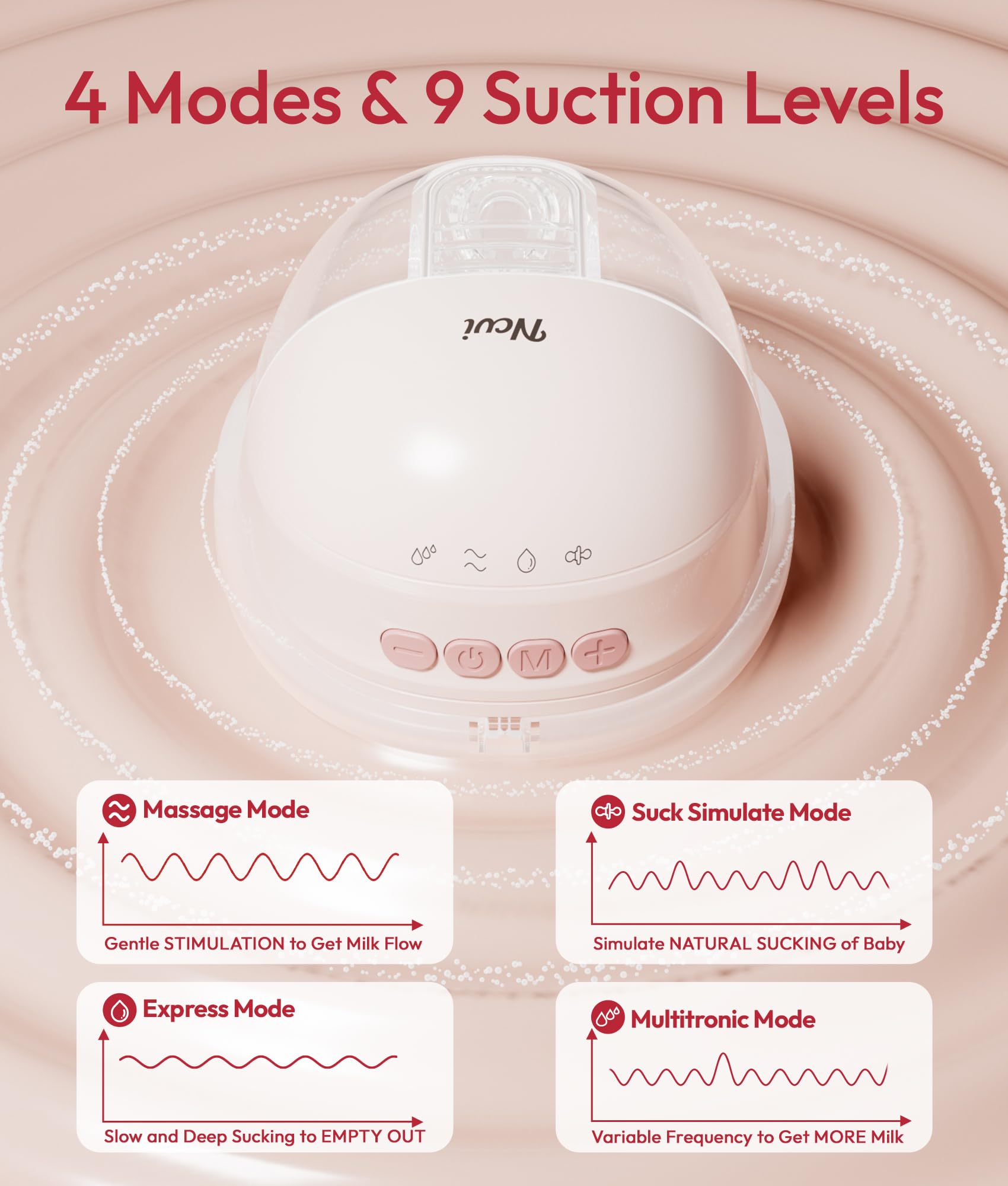 4 Smart Pumping Modes for Better Milk Flow: Includes Suck Simulation Mode, Massage Mode, Expression Mode, and Multitronic Mode, designed to mimic natural baby sucking rhythms. These thoughtful modes help stimulate let-down, encourage milk flow, and provide a more comfortable pumping experience
