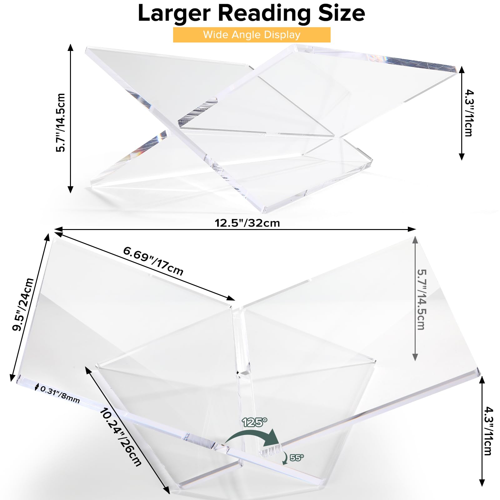 Two-piece Collapsible X design : Featuring a bright, clear modern acrylic X shape art design, this Acrylic Book Stand Holder combines style and practicality to add stylish to your space.The X-shaped design allows you to place your books steadily whether you want to read or display them. Rounded corners are more beautiful and safer.