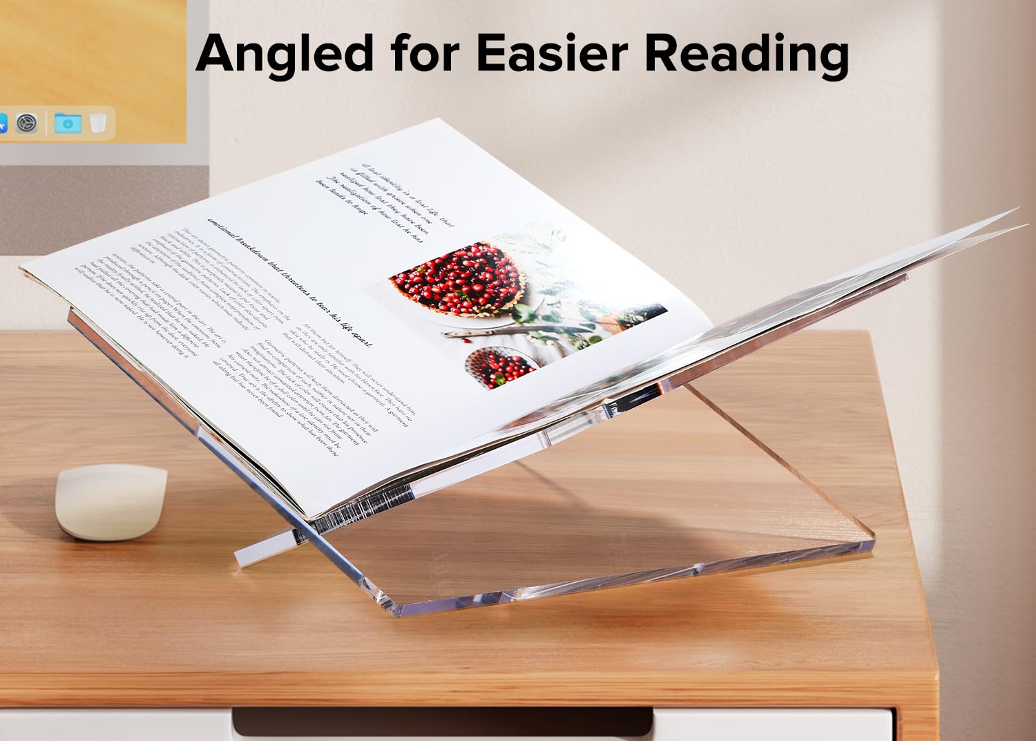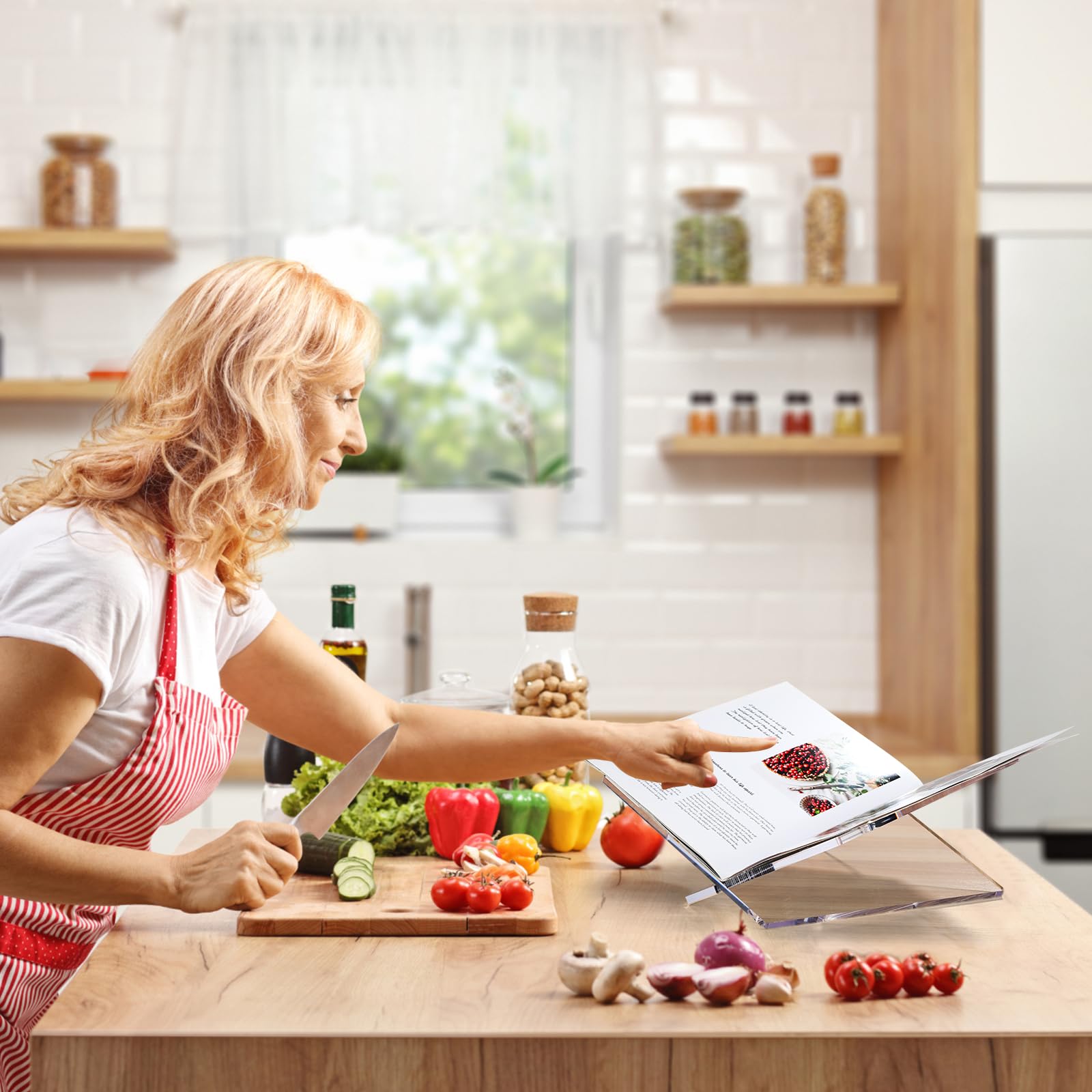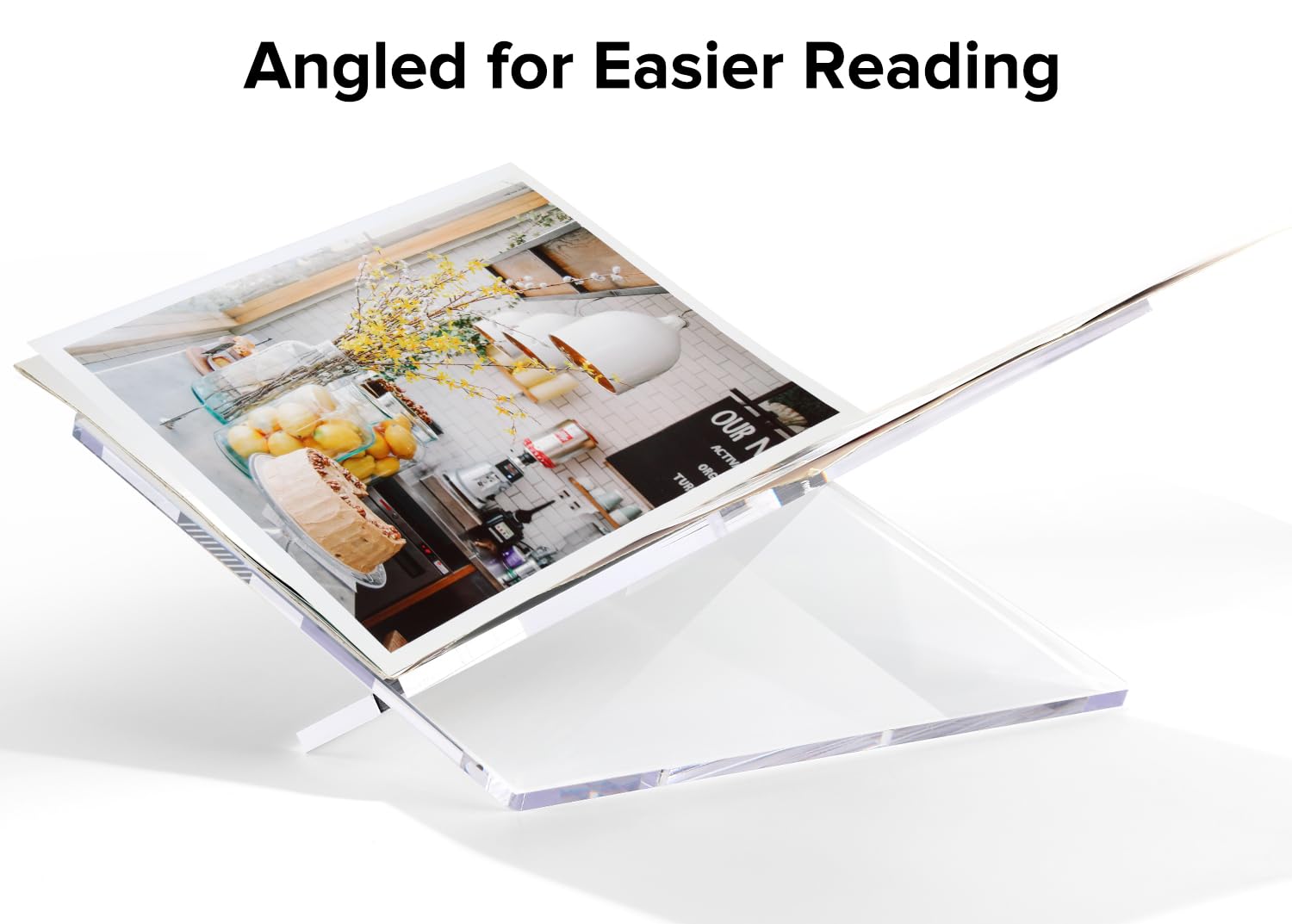 Thickened Acrylic Book Holder : This modern open book holder stand is made from 5/16in (8mm) thick acrylic making it strong and lightweight. We used 22 lbs (10 kg) of weight-bearing test, it did not crack or break at all. We specifically reinforced and thickened the cookbook stand to make it more durable and capable of holding heavier books.