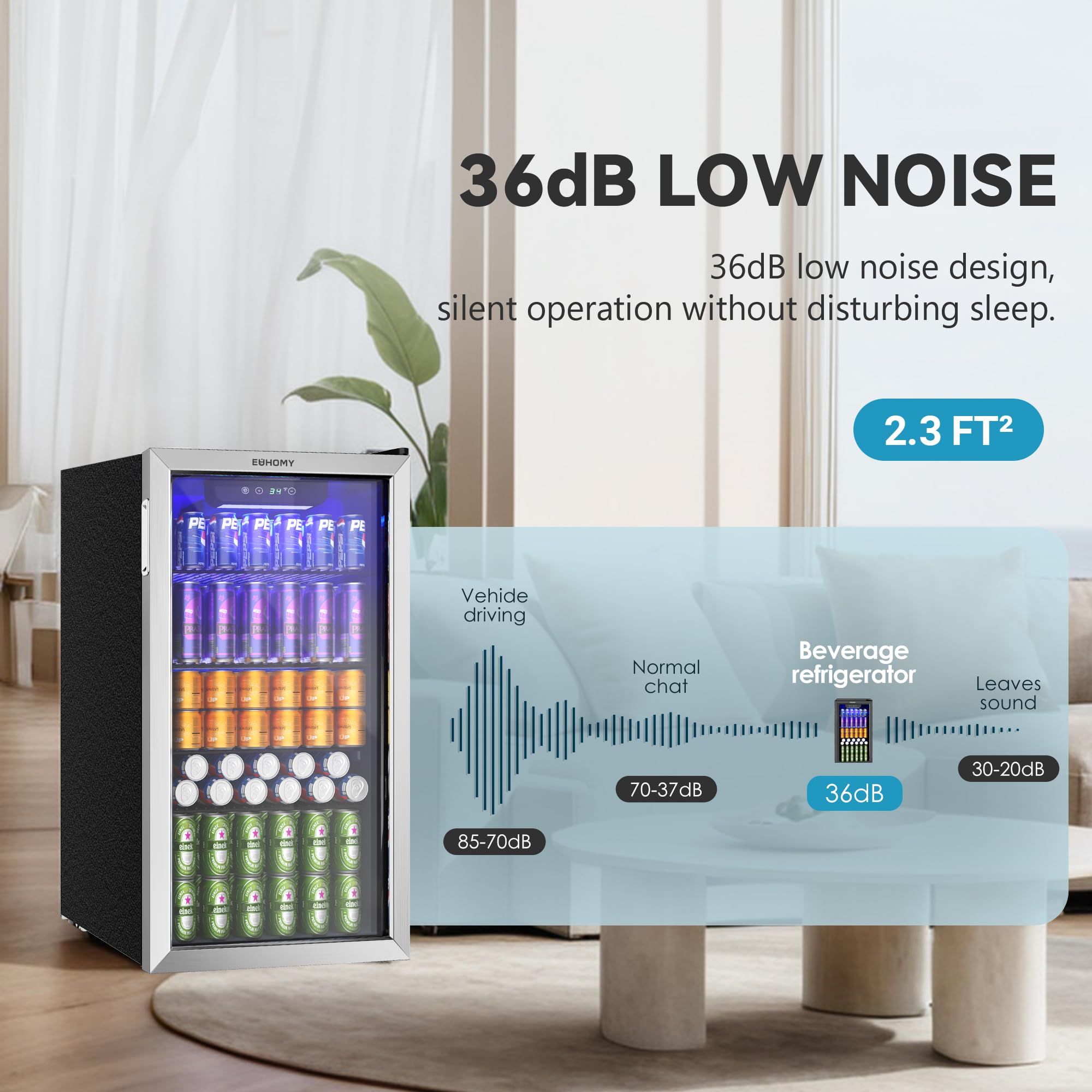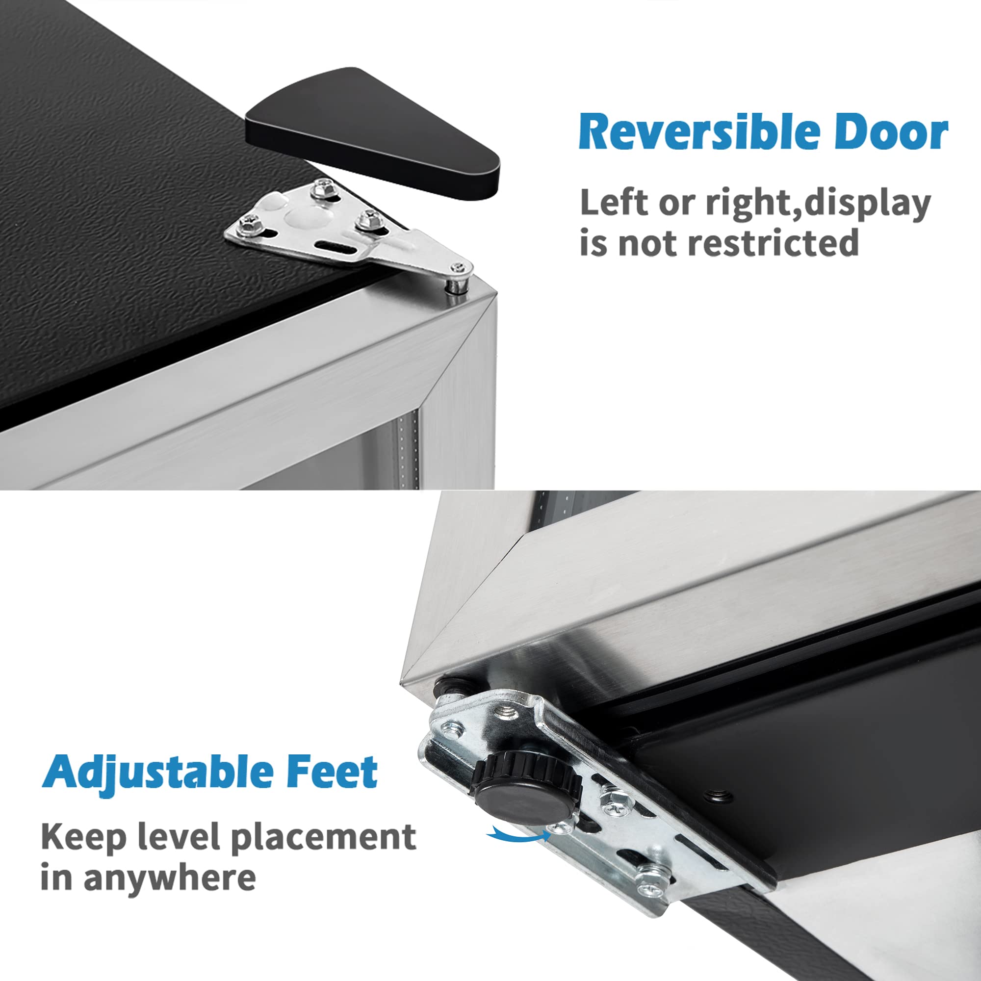 Engineered Versatility - Our premium mini fridge glass door feature height-adjustable feet for stability on uneven surfaces and reversible hinges for effortless door reversal. This sleek drink fridge houses a high-efficiency compressor, consuming just 0.74kWh/day with ultra-quiet 36dB operation—ensuring undisturbed rest while preserving your collection.