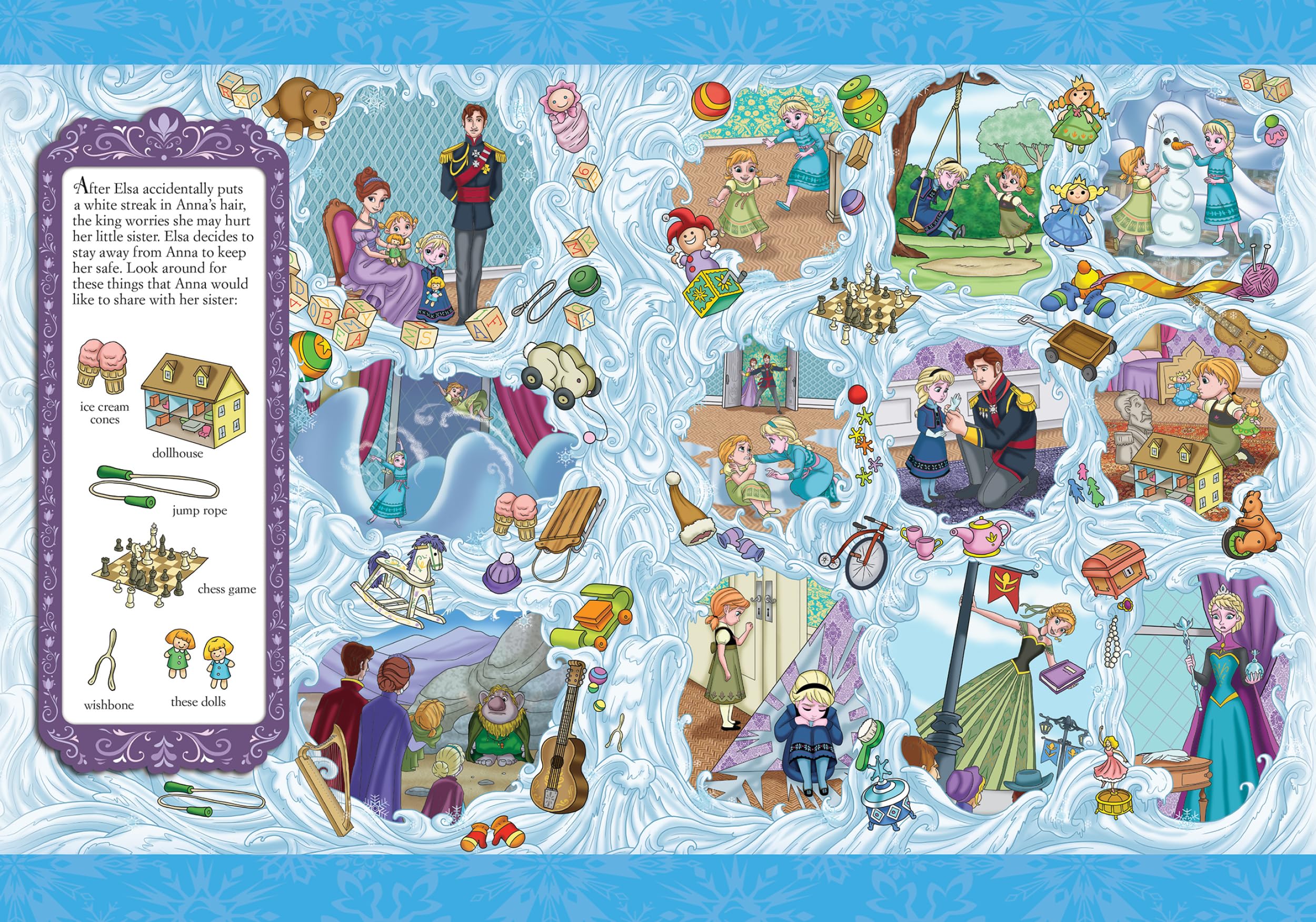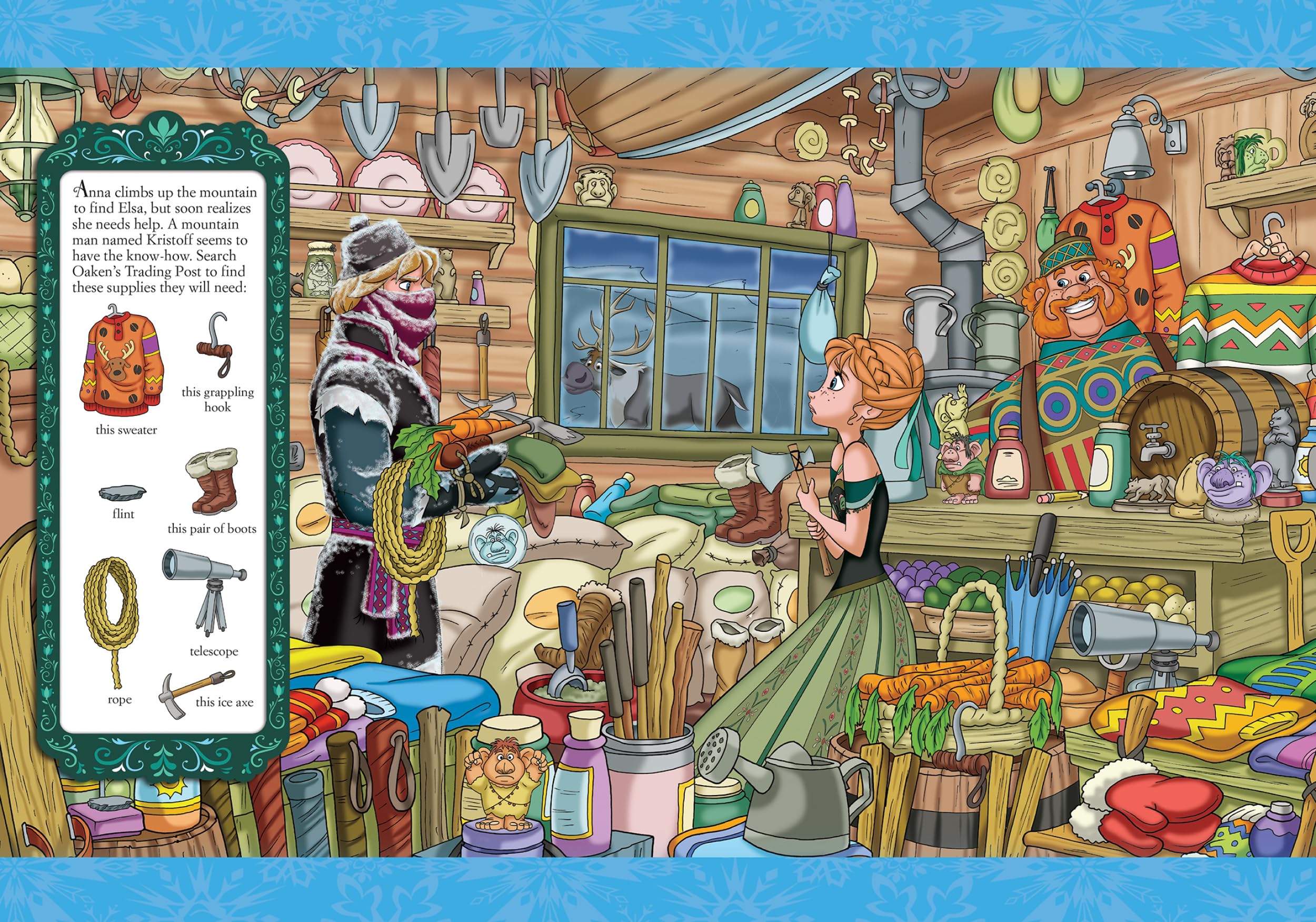 Come along with Elsa, Anna, and their friends on the icy adventure that started it all! Look for hidden objects in 8 exciting scenes inspired by Frozen. Then turn to the back of the book for even more Look and Find challenges.