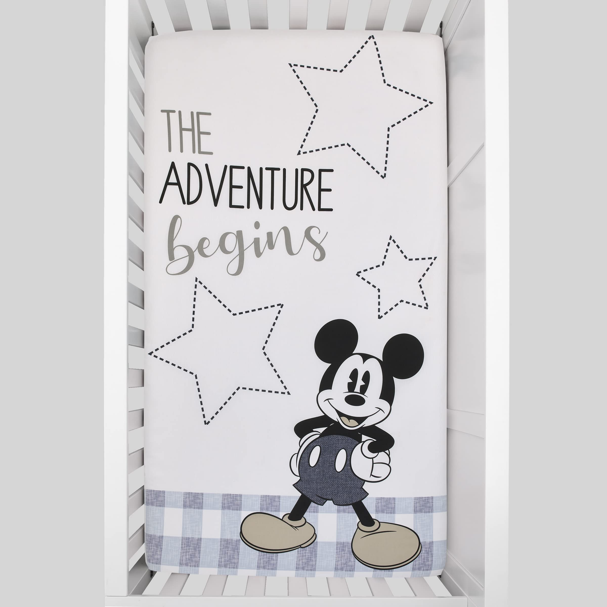 Features a white ground with stars, The Adventure Begins script and Mickey Mouse