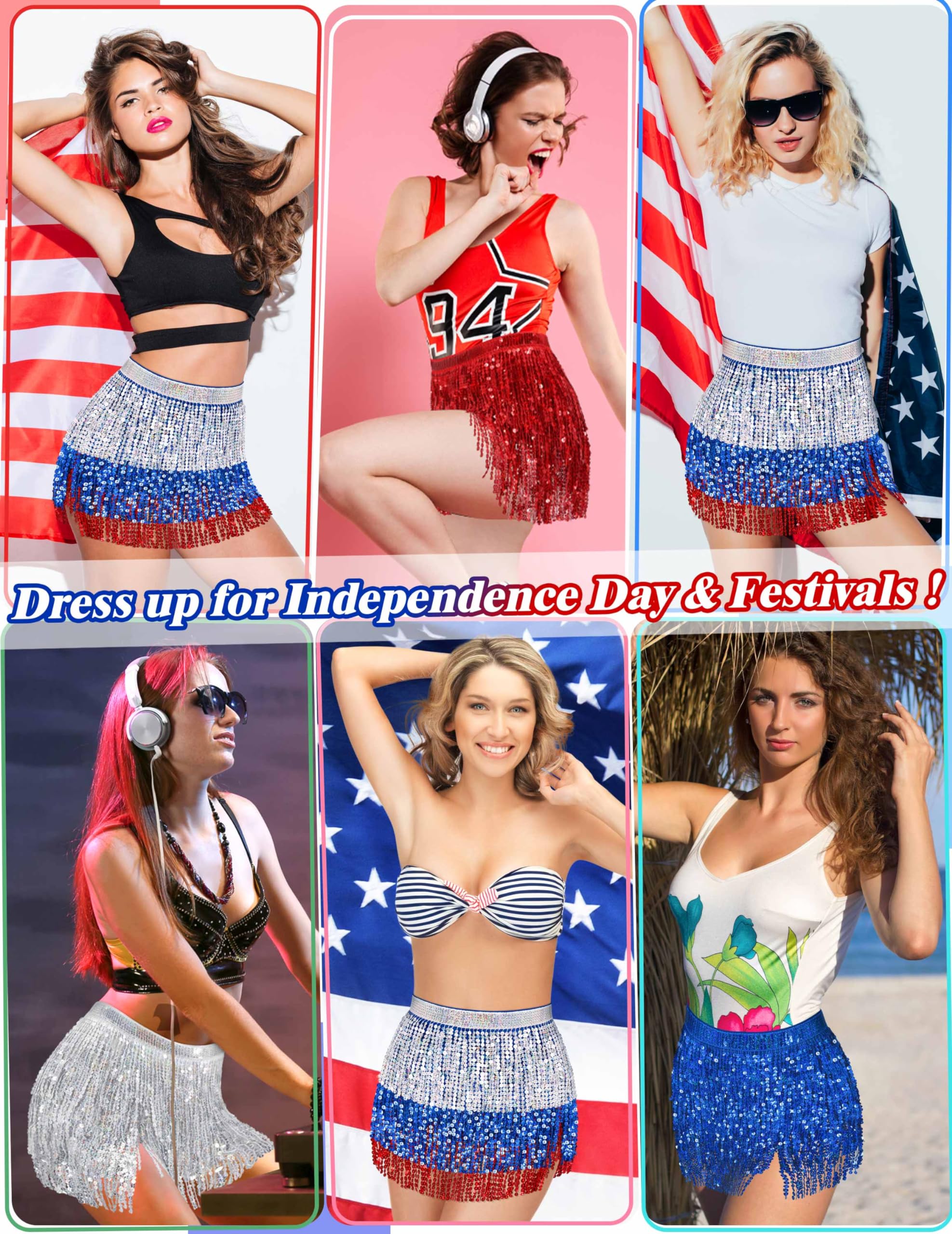 SUITABLE OCCASIONS: The fringe skirt themed on the USA Flag are perfect for parties of Independence Day, Flag Week and Patriots Day! The womens 4th of july outfit is so trendy and colorful that you will quickly grab people's attention wherever you go. The red and black fit devils and vampires at Halloween, the green are great for Christmas and St. Patrick's Day. Besides, the glitter skirt is very suitable for belly dance, disco, carnival, beach and so on. Wear the skirt, you'll be sexy queen.