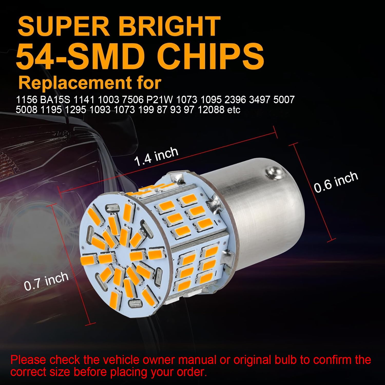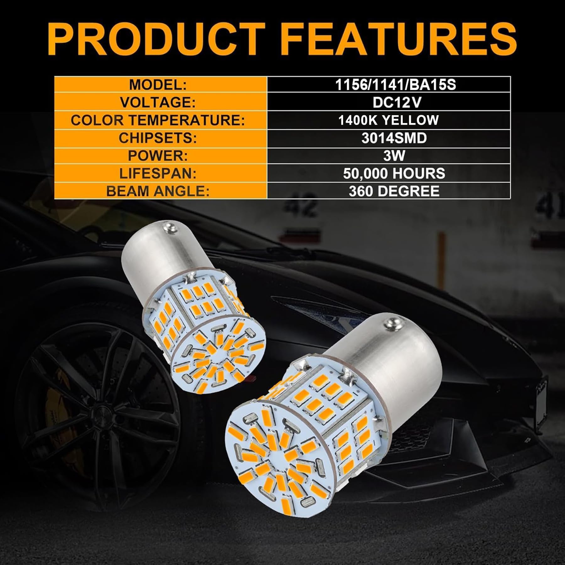 Key Specs: Voltage DC 12V, 1400K Amber Yellow, Wattage 3w, low power consumption and fast heat dissipation for longer lifespan. The 1156 led light bulbs are compatible with BA15S 1156 1141 1003 7506 P21W 1073 1095 2396 3497 5007 5008 1195 1295 1093 1073 199 87 93 97 12088 etc.