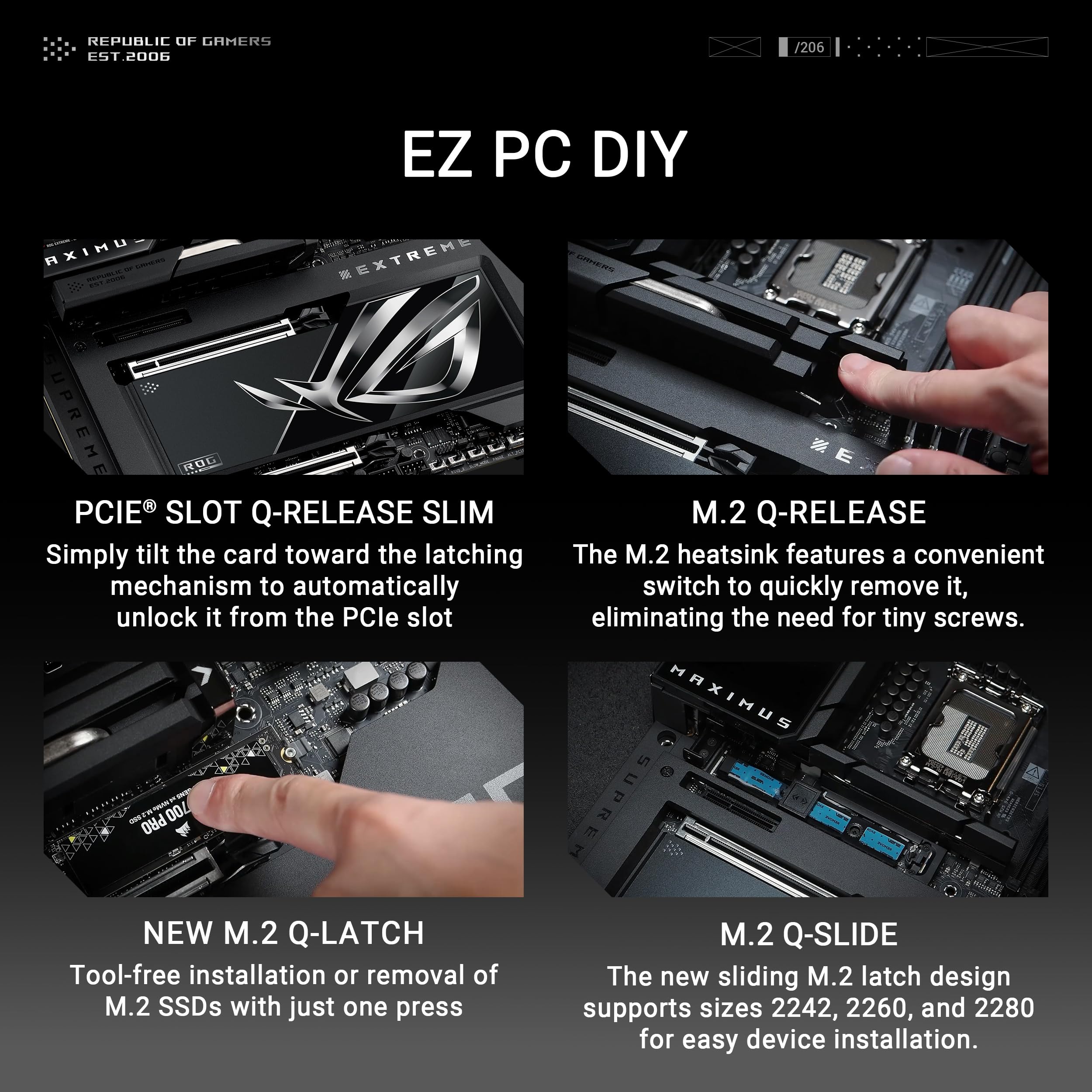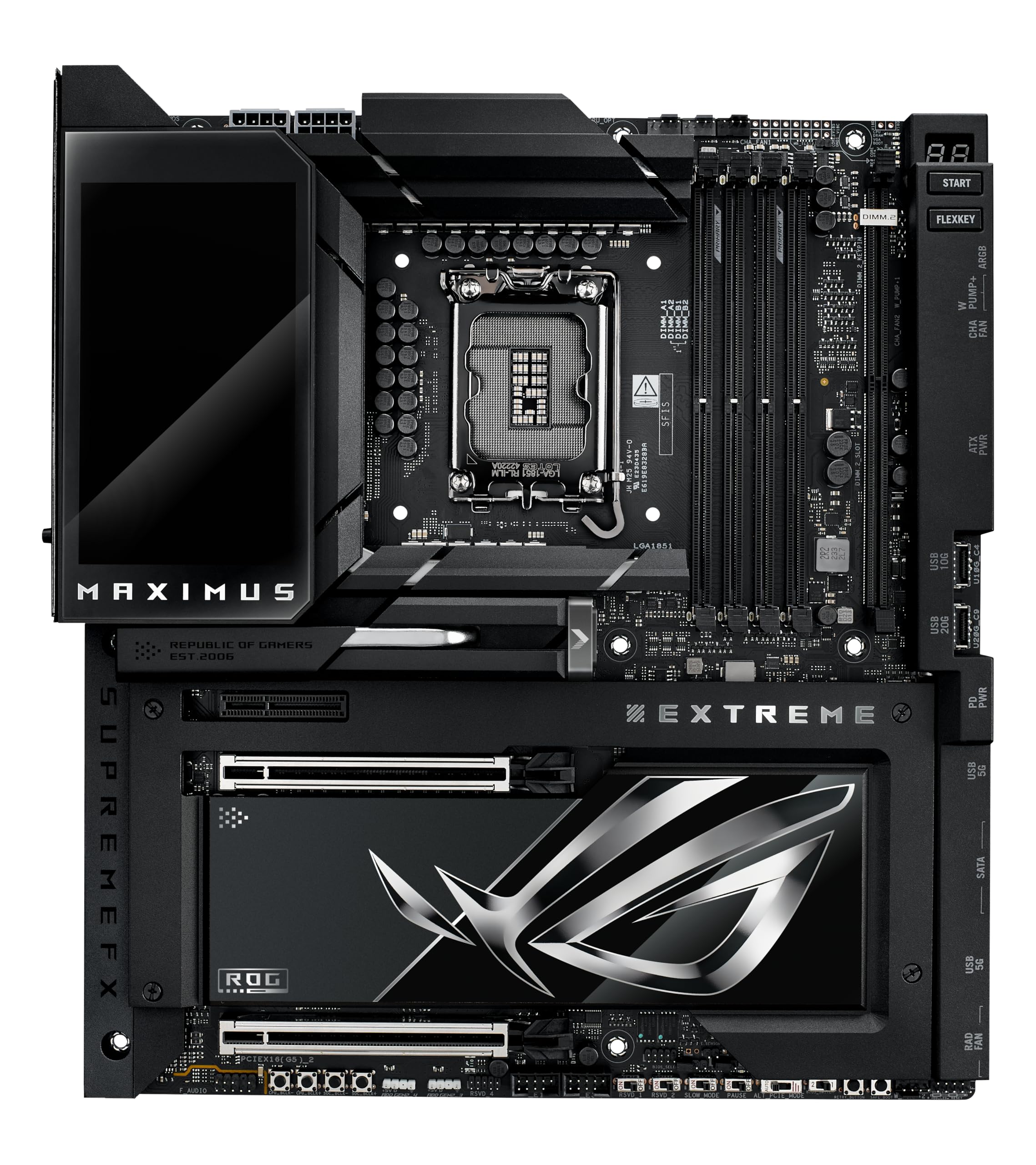 ASUS ROG MAXIMUS Z890 EXTREME Intel® Z890 LGA 1851 E-ATX motherboard, Advanced AI PC-ready, 24+2+1+2 power stages, DDR5 NitroPath, AEMP III, WiFi 7 Q-Antenna, three PCIe® 5.0 M.2, ROG Q-DIMM.2 card, PCIe Slot Q-Release Slim, Thunderbolt™ 5, USB Type-C®, AI Overclocking, AI Cooling II, AI Networking II, 5” LCD Display