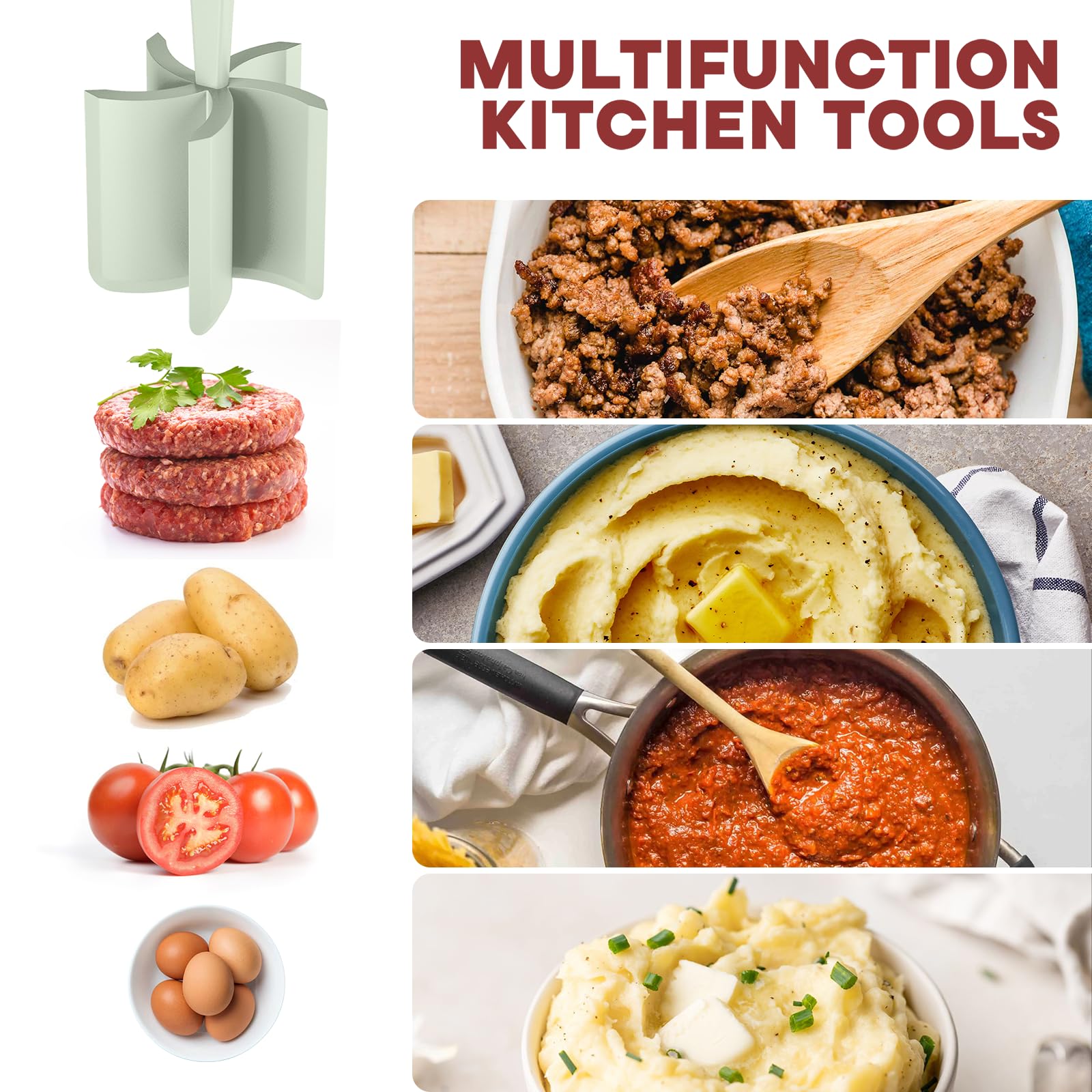 Perfect Kitchen Tool: Our meat chopper tool with 5 wide beveled pinwheel blades, which is easier to chop and crumble food than other products with three or four blades. This meat masher can not only chop all kinds of meats for quick cooking, but is also very suitable for mixing and mashing other foods, such as gelatin, fruits, vegetables, etc.