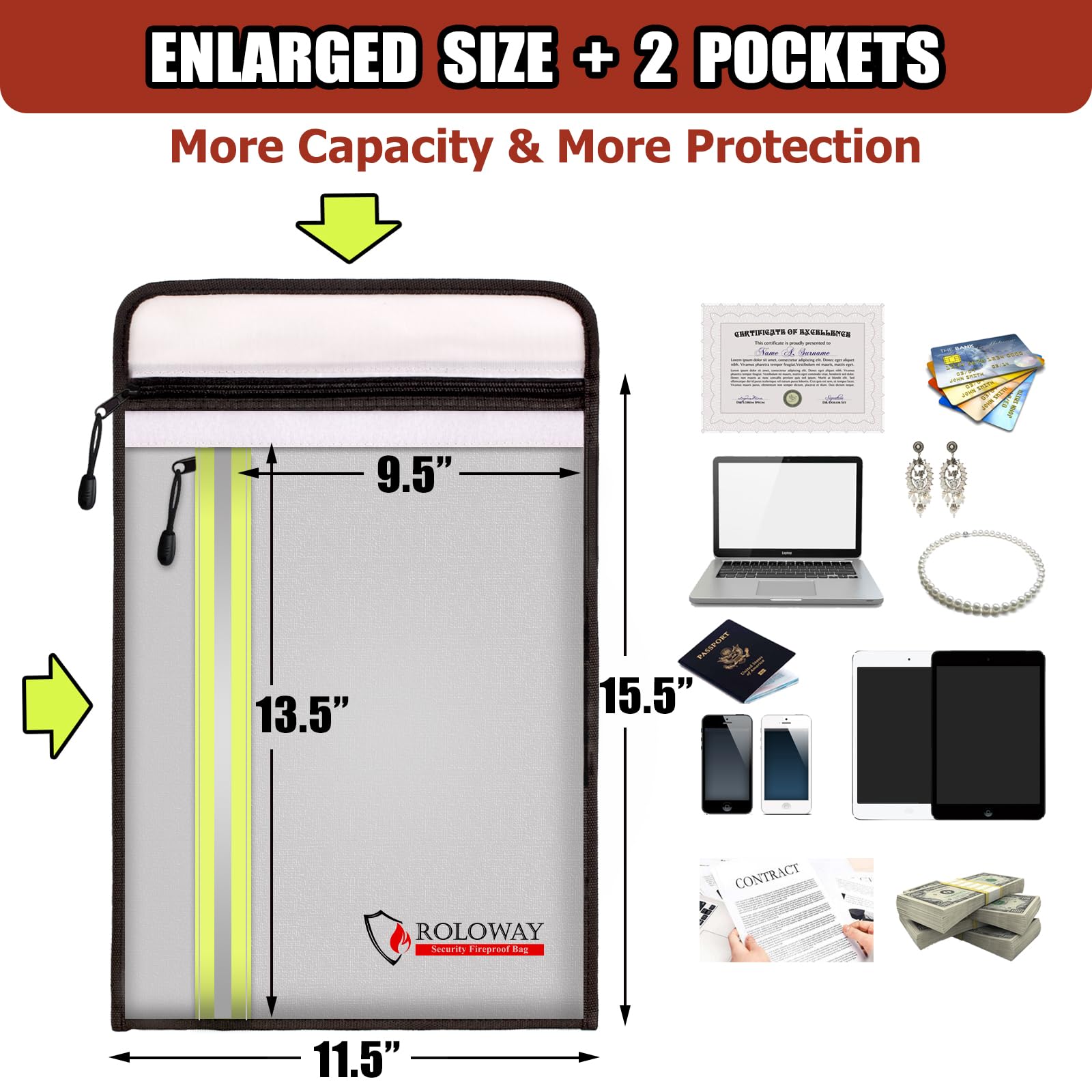 [ENHANCED SIZE & 2-POCKET DESIGN]: This new version of our fireproof bag for documents comes with 2 larger pockets for convenience. The Big Pocket (15.5 x 11.5 inches) is a fireproof document pouch that provides SPACIOUS room for LEGAL SIZE DOCUMENTS, laptops, and other important document storage. Meanwhile, the Front Pocket (13.5 x 9.5 inches) is great for A4 FILES, cash, passports, jewelry, and more. Secure your vital items with our fireproof document bag / fire proof bag for documents.