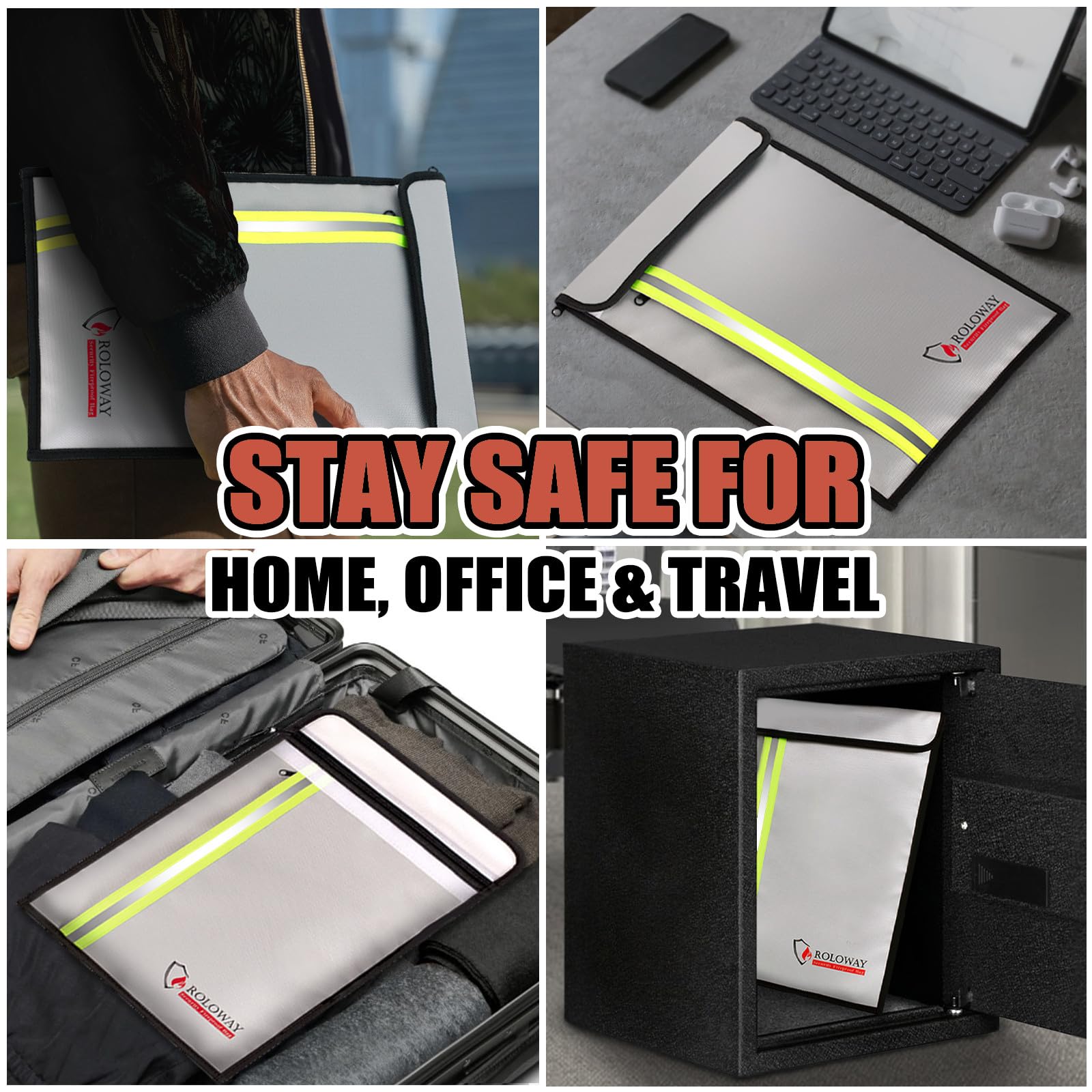 [NIGHT REFLECTIVE STRIP DESIGN]: In emergencies, time is of the essence. Our fireproof money bag for cash features a Reflective Strip for quick and easy access, even in the dark. The high visibility design ensures faster retrieval of your valuables, making our fire document storage ideal for a Grab & Go. With water-resistant, NON-ITCHY SILICONE COATED FIBERGLASS, and a PORTABLE DESIGN, our document bag fireproof offers unmatched convenience for home, office, or travel.