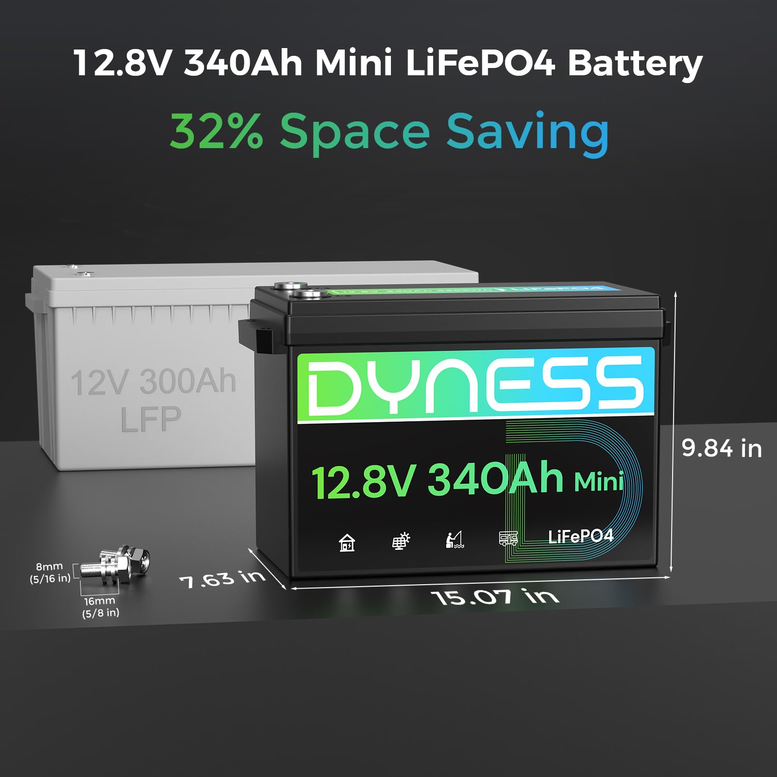 【Space-Saving & High Energy Density】The Dyness Mini 12.8V 340Ah lithium battery features a compact size of just 15.08 x 7.64 x 9.64 inches (0.64 cubic feet) and weighs 59.08 pounds. It delivers 4352Wh of usable capacity—exceeding the combined capacity of three 12V 100Ah batteries in parallel. Compared to traditional solutions, it occupies 50% less space and reduces parallel wiring requirements, making it ideal for extended power supply needs during RV travel.