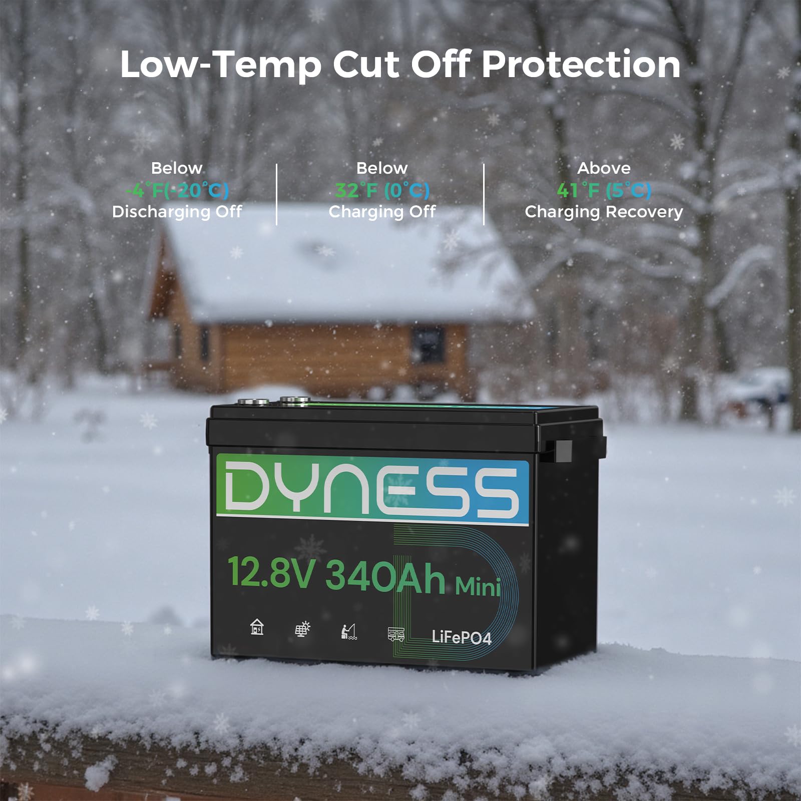 【Low-Temp Charging Protection】Don't let winter kill your battery! Dyness 12V lithium Battery with low temperature charging protection feature, automatically disconnects charging when the LiFePO4 Battery's temperature drops below 32°F (0°C), with charging resuming at 41°F (5°C). Additionally, it automatically cuts off power at -4°F (-20°C) to further safeguard the battery. This means: ✅ No more cold-weather damage during charging ✅ Extended battery lifespan – season after season ✅ True peace of mind in RVs, cabins, or off-grid setups